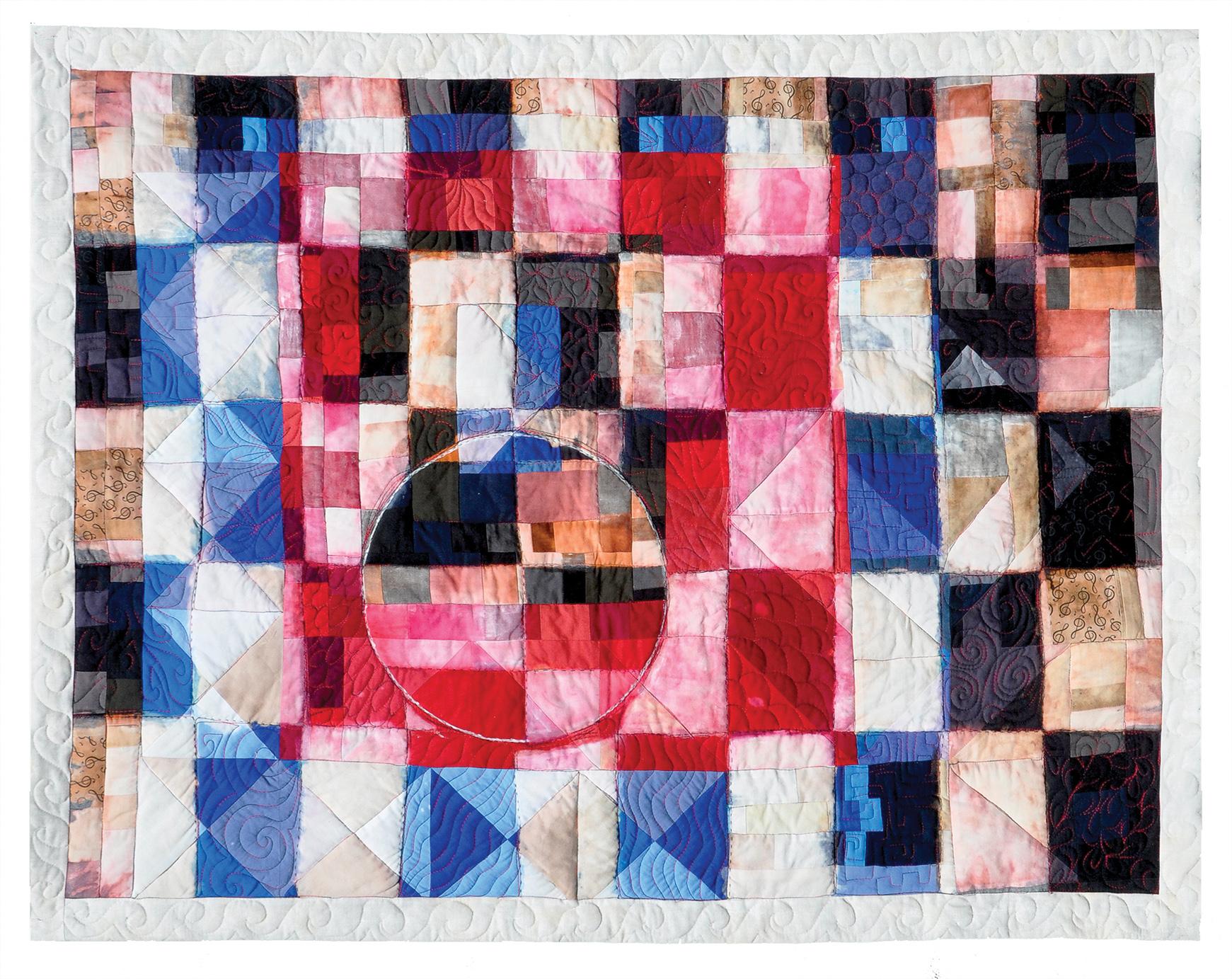Machine pieced, discharge dyeing, sashiko stitching around all bleached areas. Machine quilted.