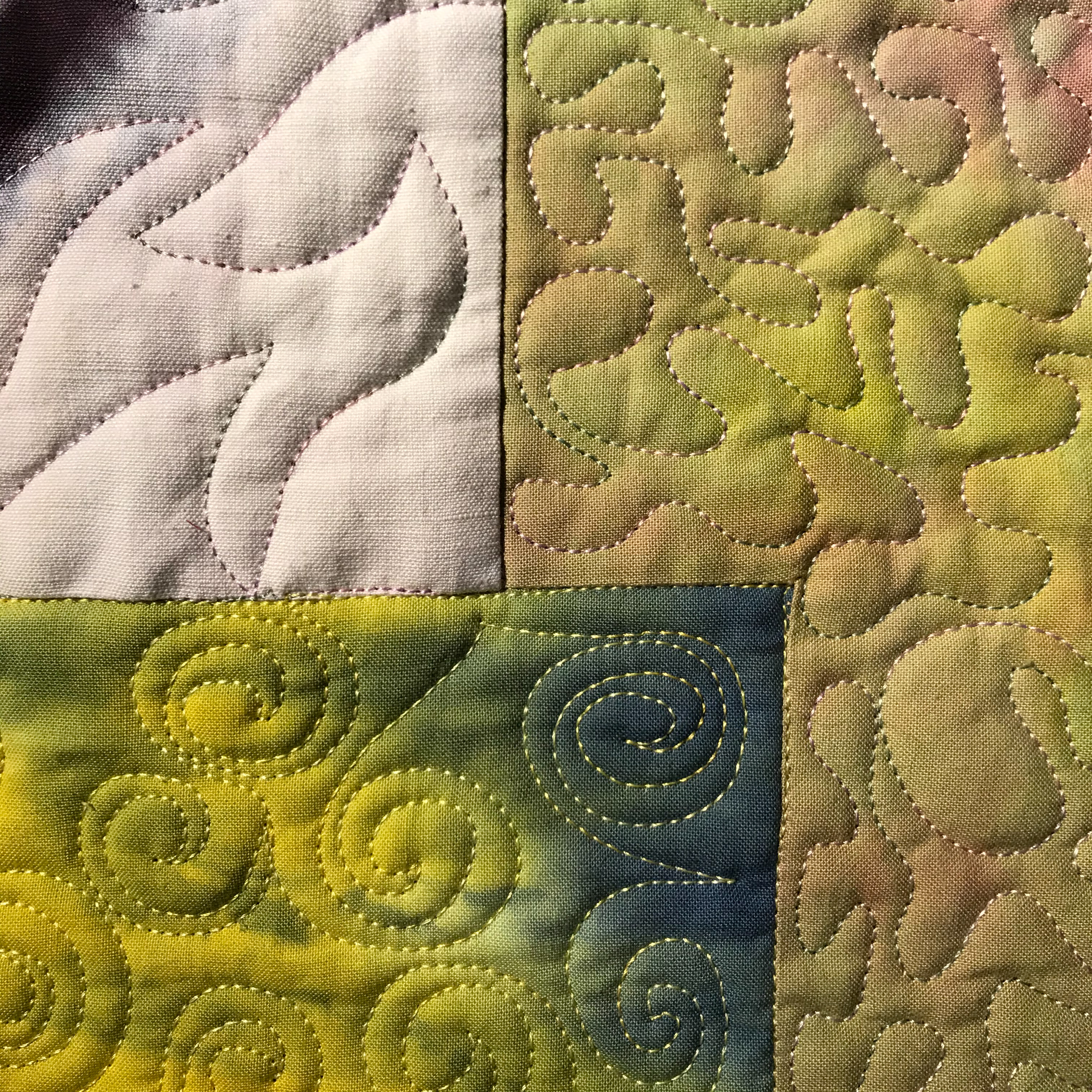 Hand dyed cotton and linen using different printing techniques. Fantastico Superior Thread for quilting. Batting Cotton 80/20.