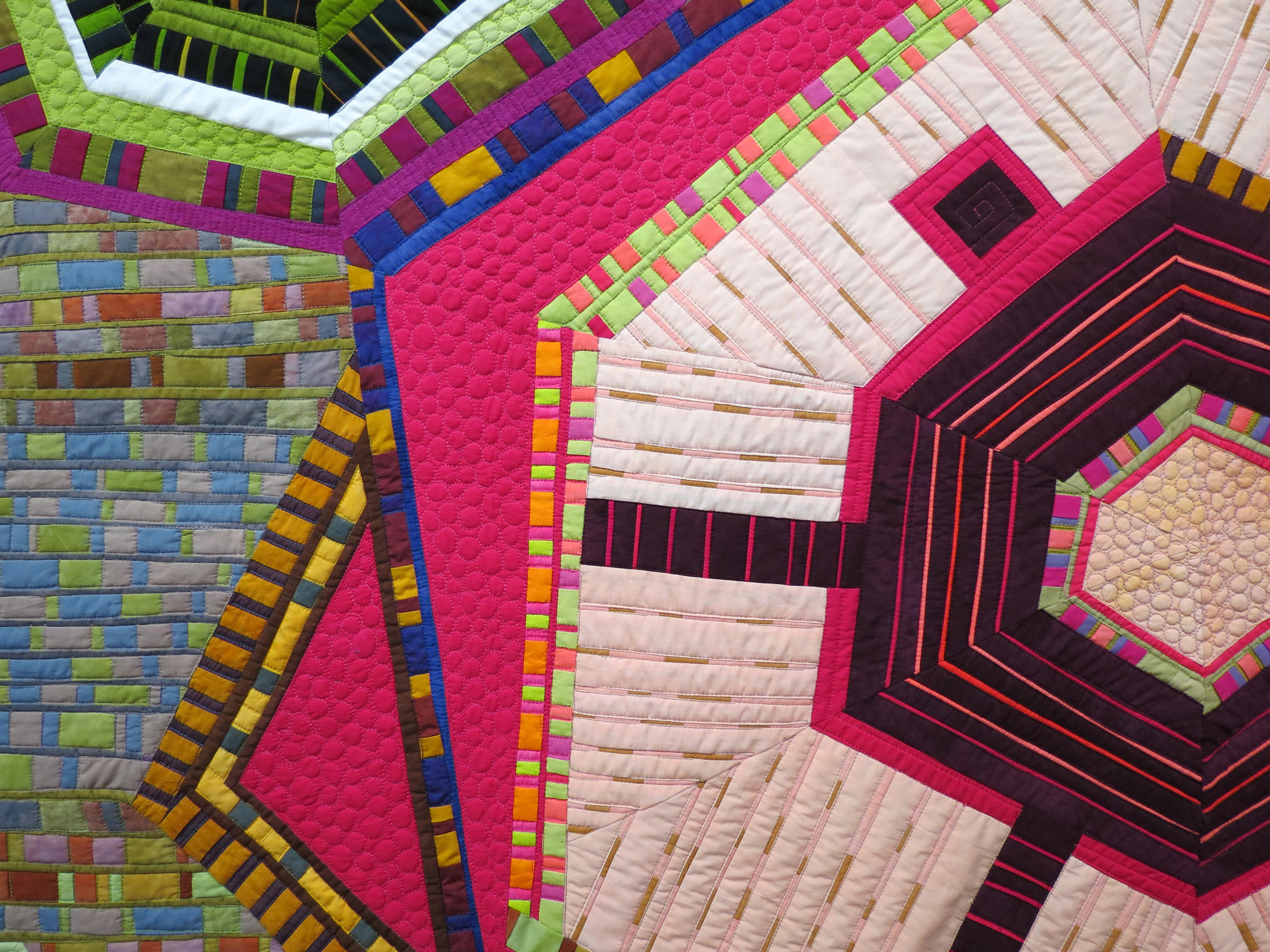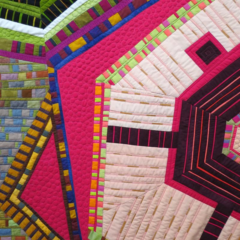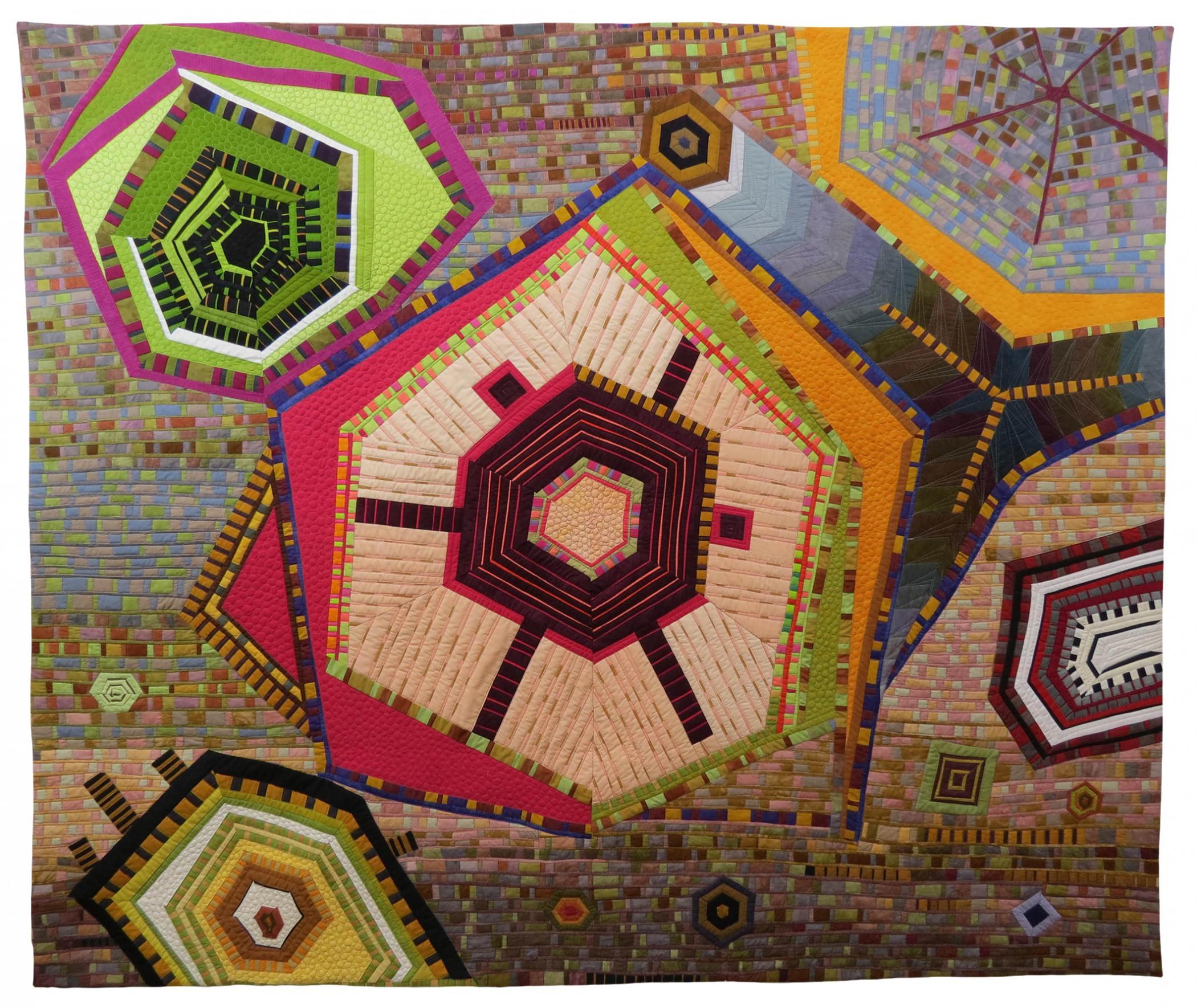 Strange Attractor #23 is composed entirely of solid-colored fabric. I incorporated leftover “scraps” from earlier work whenever possible. My passion for intricate piecing, subtle variations in color, and organic textures and forms, results in ever-unfolding visual imagery. I am inspired by the interface between regular patterning and apparent randomness.