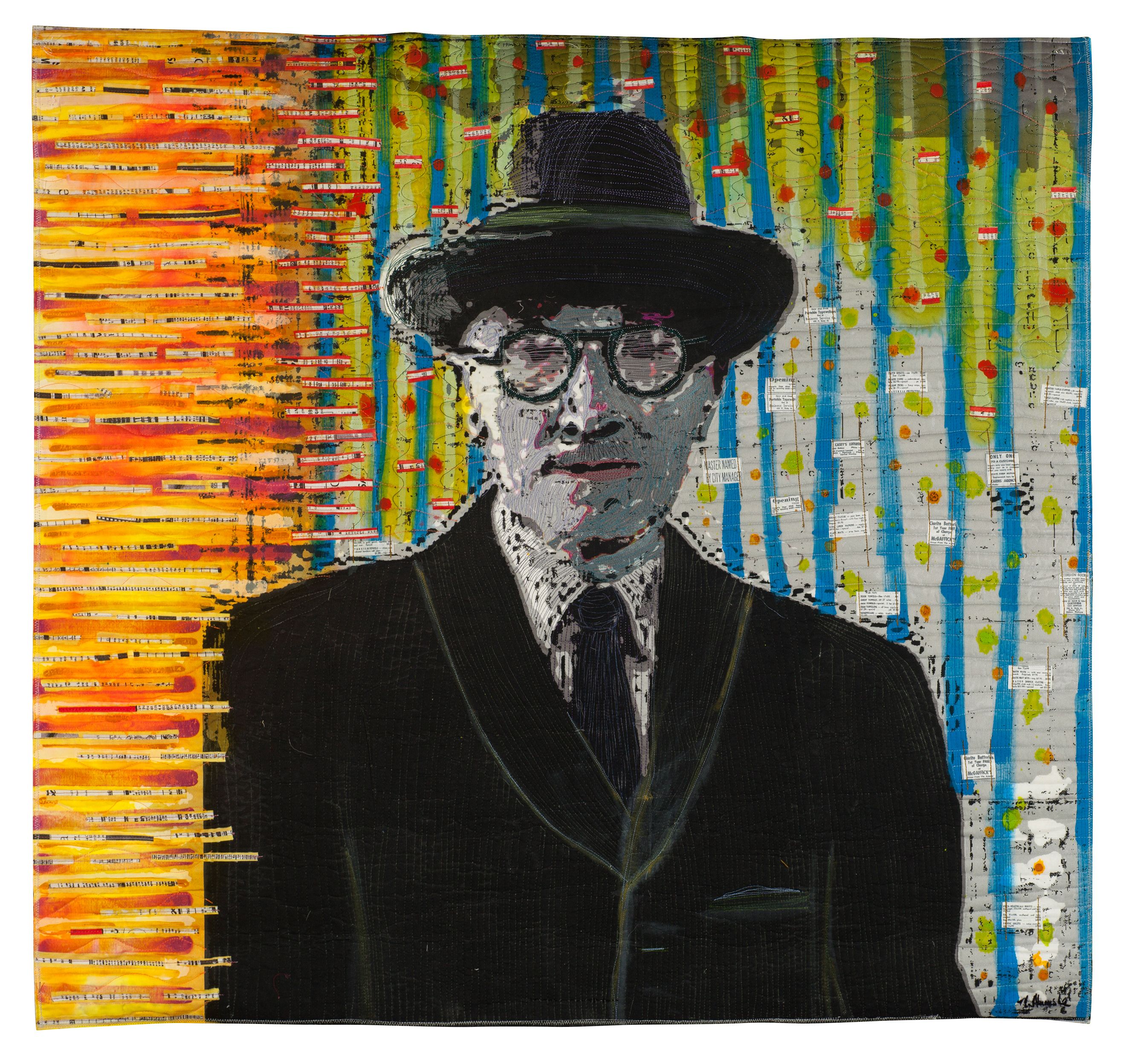 The image is of my paternal grandfather. He is prepared for travel, with his heavy wool overcoat and his best hat. My grandfather was like most Americans who fled oppression and economic hardship. He was one of millions of immigrants who traveled here to a better life. This quilt is my prayer for every stranger who is forced to leave a place of familiarity. My hope is that there will be many people and places in the world that will open their arms to these new “strangers in a strange land.”