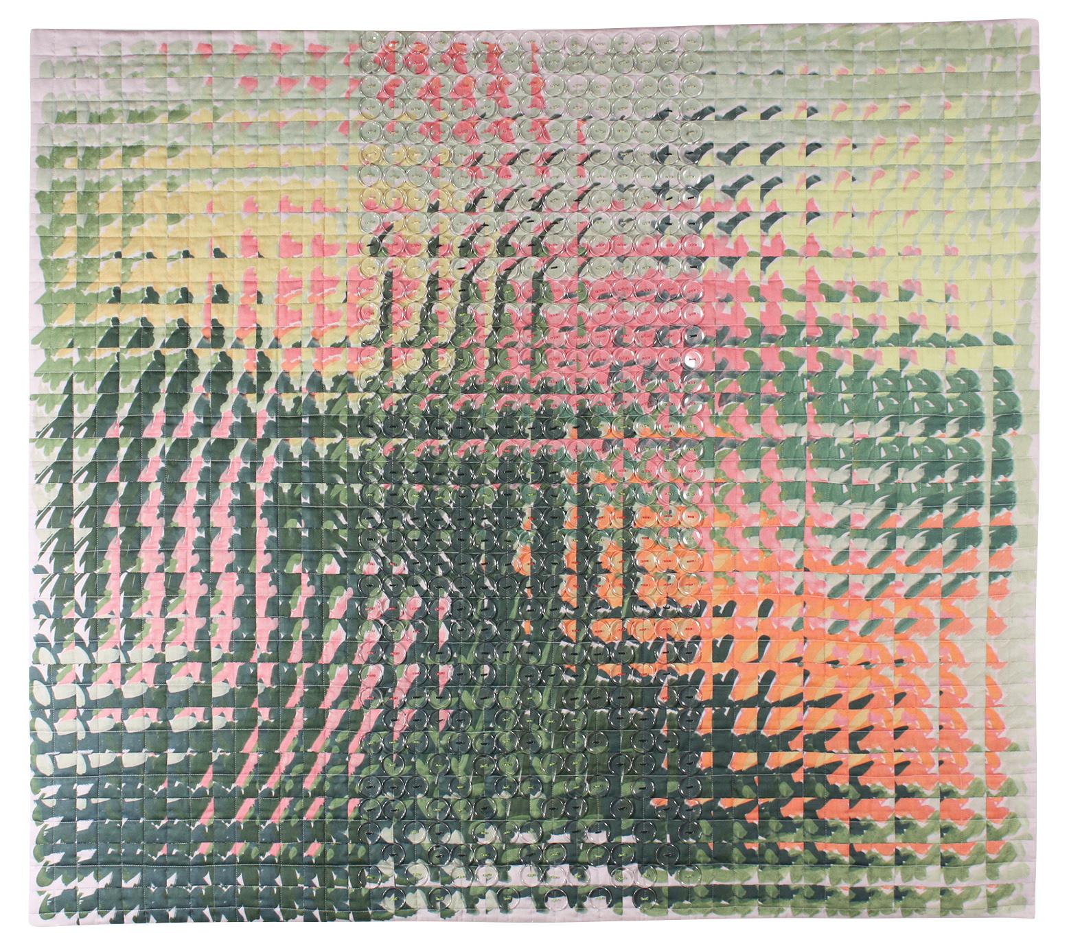 This quilt uses fabric printed with multiple copies of my abstract painting. The fabric is divided into many small squares, no two exactly alike. When the squares are sewn together, the image seems to move across and down the surface of the quilt. It is embellished with a cascade of clear plastic buttons, which reminded me of a summer rain shower.