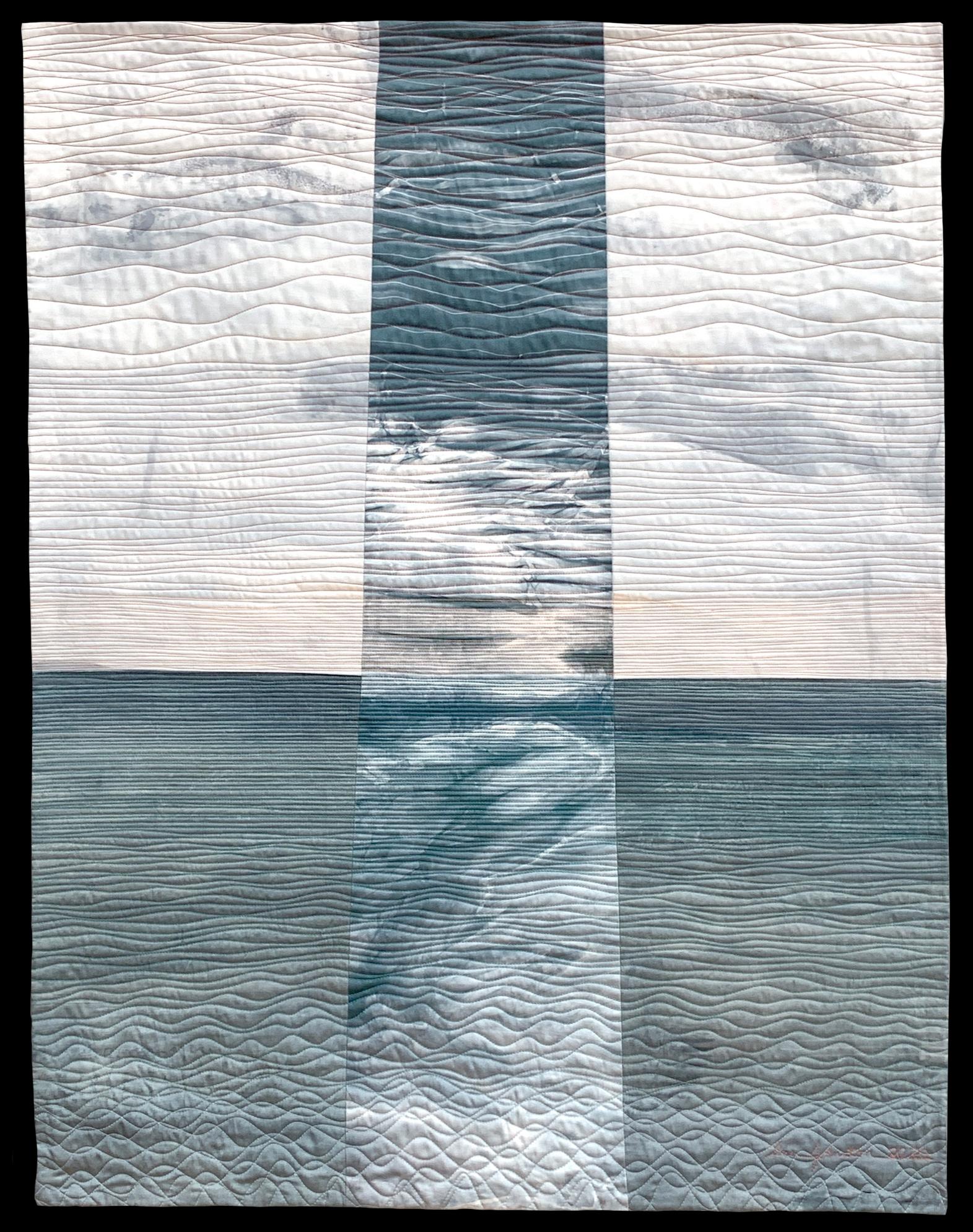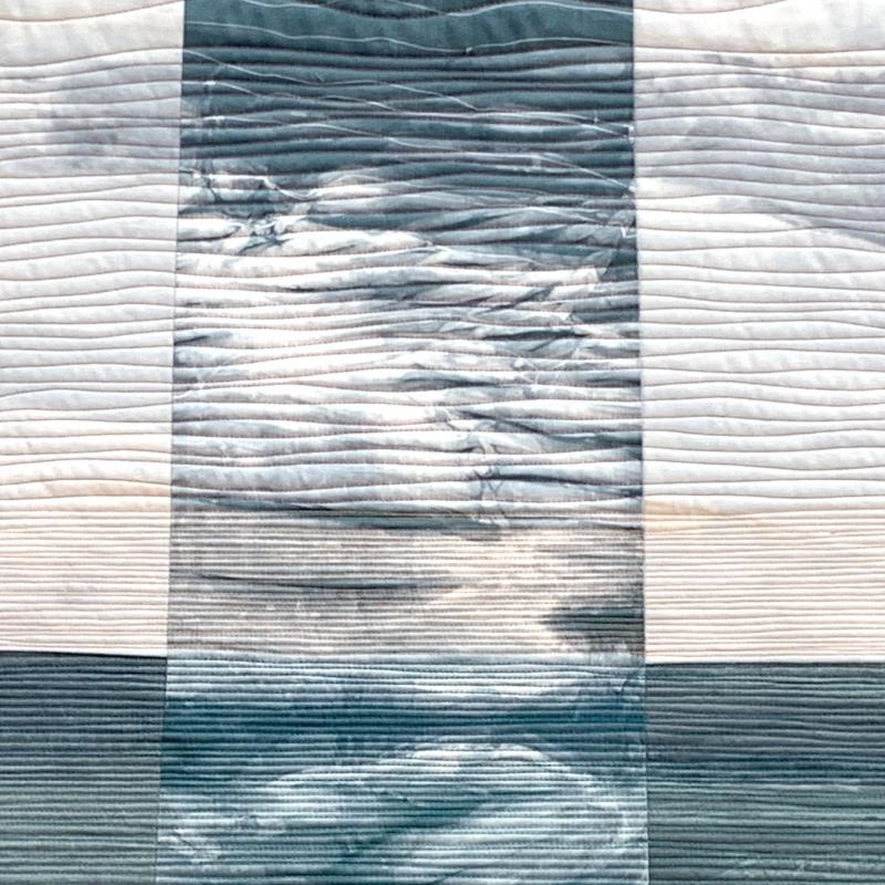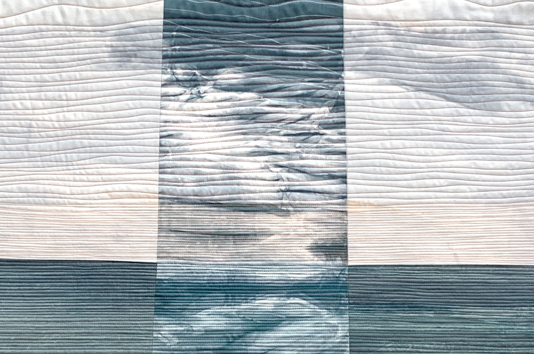 I have long wanted to make simple designs, but while designing and making, very often, complexity erupts. This five-piece composition sat unquilted for months, and the simplest answer finally came: horizontal lines, changing only spacing and thread color.
