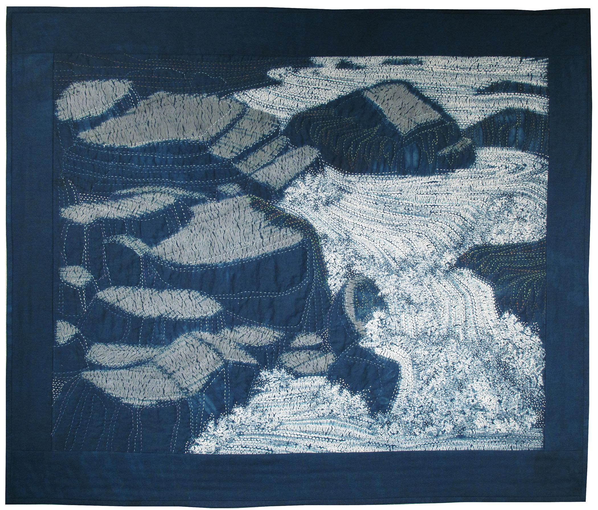 Shibori stitched techniques, indigo dyeing and whole cloth quilt traditions give me the tools to depict in fabric the surging surf at the rocky shore at Cape Ann, MA. It's ironic that the calm, almost meditative act of indigo dyeing and the soothing rhythm of the hand stitching used in both shibori and quilting can create such an energetic image. Since 1990, landscape has given me more ideas for quilts than I have time to make them.