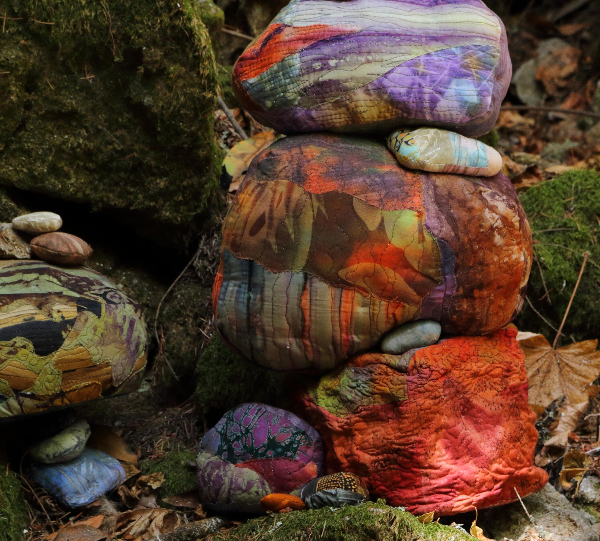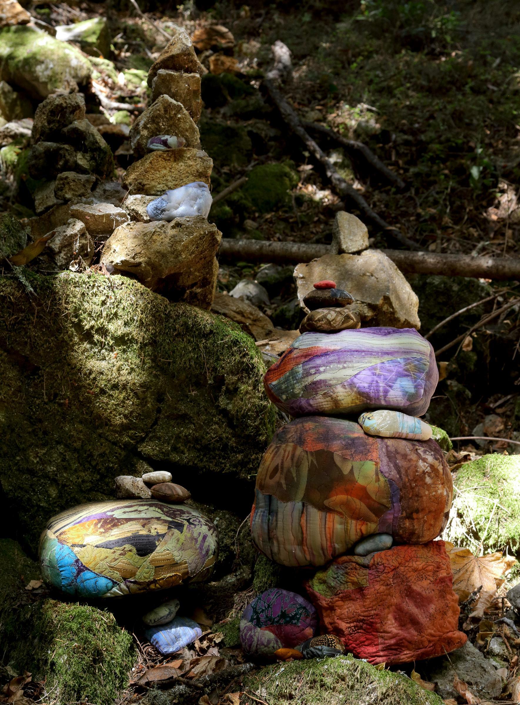 I have always been interested in the rock cairns that people build as beach art and trail markers. In the course of my career, I’ve made a number of similar cairns out of collaged and quilted cloth rocks. On a recent hike I discovered the perfect place to install such a piece outdoors. About a mile into the Pogonip Open Space preserve, near where I live in Northern California, is an abandoned quarry that visitors have filled with these stone stacks. There are hundreds of cairns in the quarry, many of them adorned with notes, charms, and other odd souvenirs. Last week my husband/photographer and I hiked into the site with a backpack full of sculpture and a bag full of extra cloth rocks. I arranged my work among the “real” cairns at the back of the quarry, and then Marty worked hard to capture the installation in the dappled and variable afternoon light. It was a memorable day.