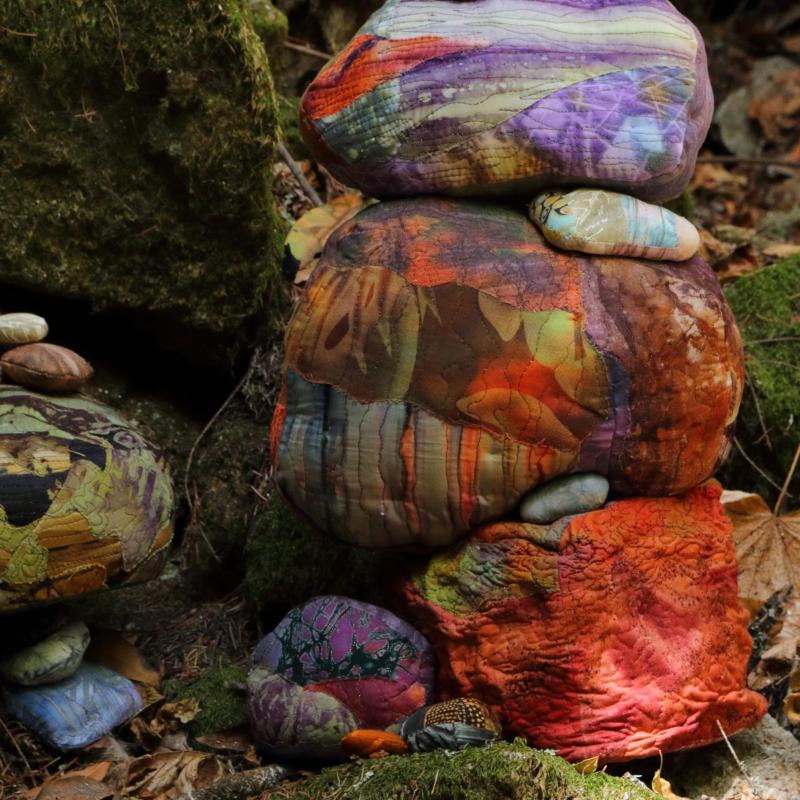 Collaged and quilted cloth over armature, installed among stone cairns built by other visitors