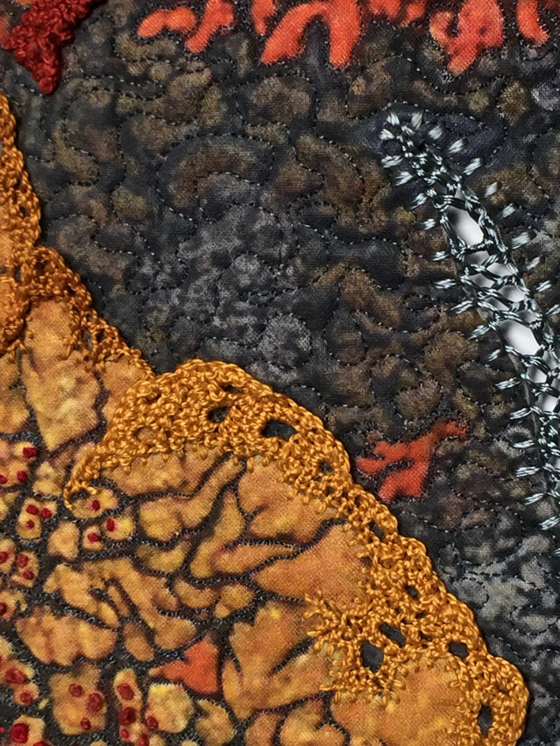 Amazing beauty can often be found lurking subtly at our feet. Walking one morning I came across this orange and yellow lichen growing on a concrete stair. Stunning! It is not unusual for me to be looking at the ground, as I am often found photographing sewers, pavement, small plants and fungi while others look at and photograph vistas. My photograph of the lichen was the starting point for transforming the lichen into a textile. Several techniques were used in its creation.