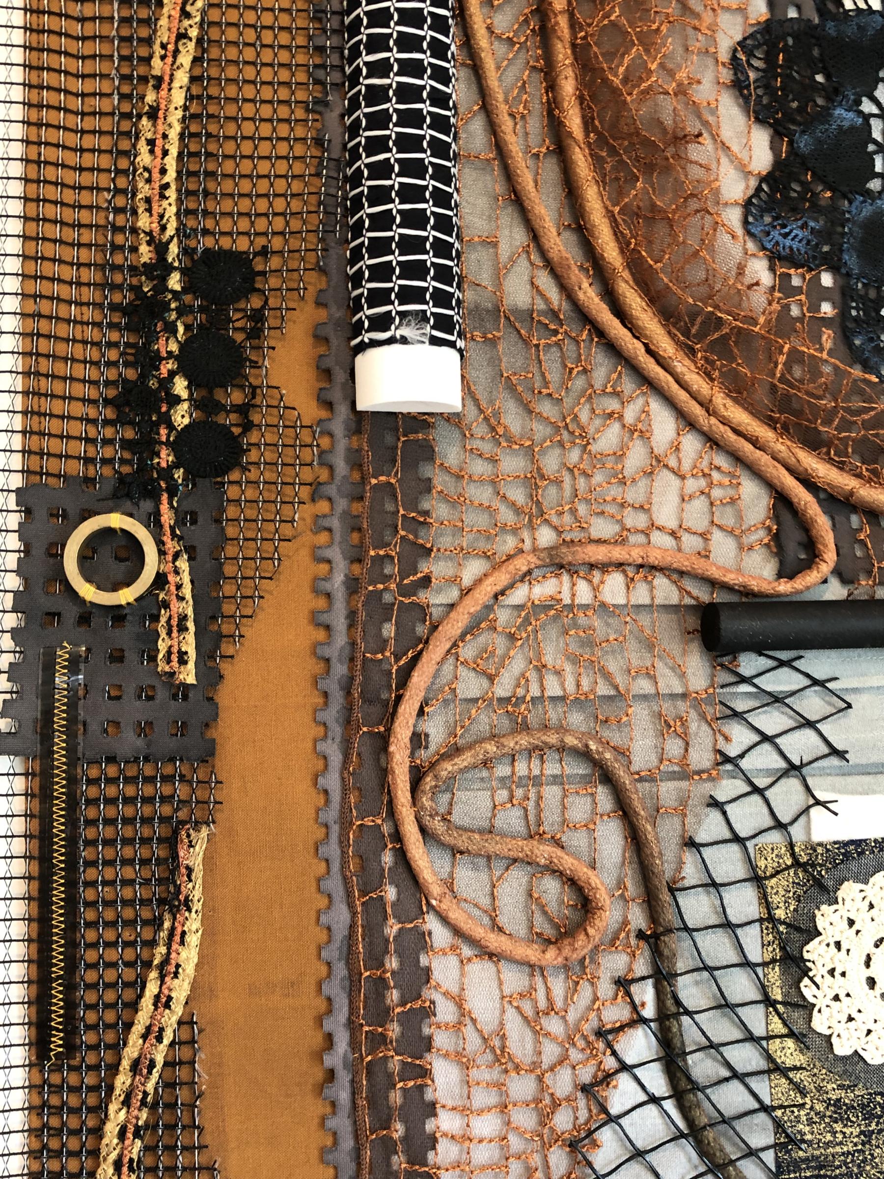 So many traditional quilts are based on the grid. I sought to use materials with grid-like markings to pay homage to the past. Working intuitively, I combined unlikely and unusual materials such as repurposed plastics, metal, and vintage doilies to become building blocks. Surprising the viewer with the unexpected, I intentionally created disturbances across the surface. If a material could be cut and stitched, then it was fair game!