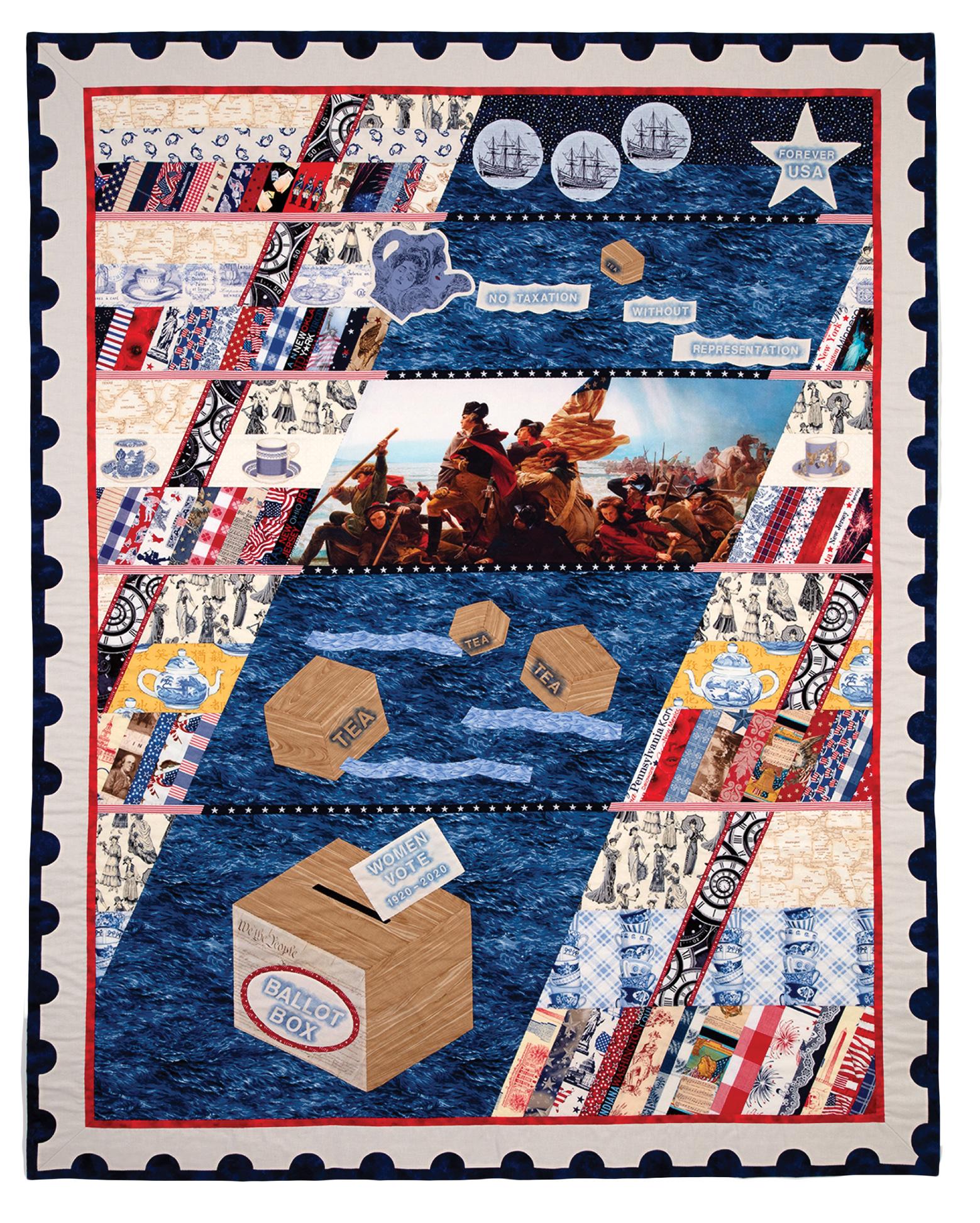 Suffragists protested at the centennial of the Boston Tea Party in 1873 with cries of "No taxation without representation." I designed this quilt as if it were a commemorative postage stamp depicting tea crates floating from Boston to Washington, DC, where they are transformed into a ballot box. The design celebrates the centennial of women's right to vote in 2020.