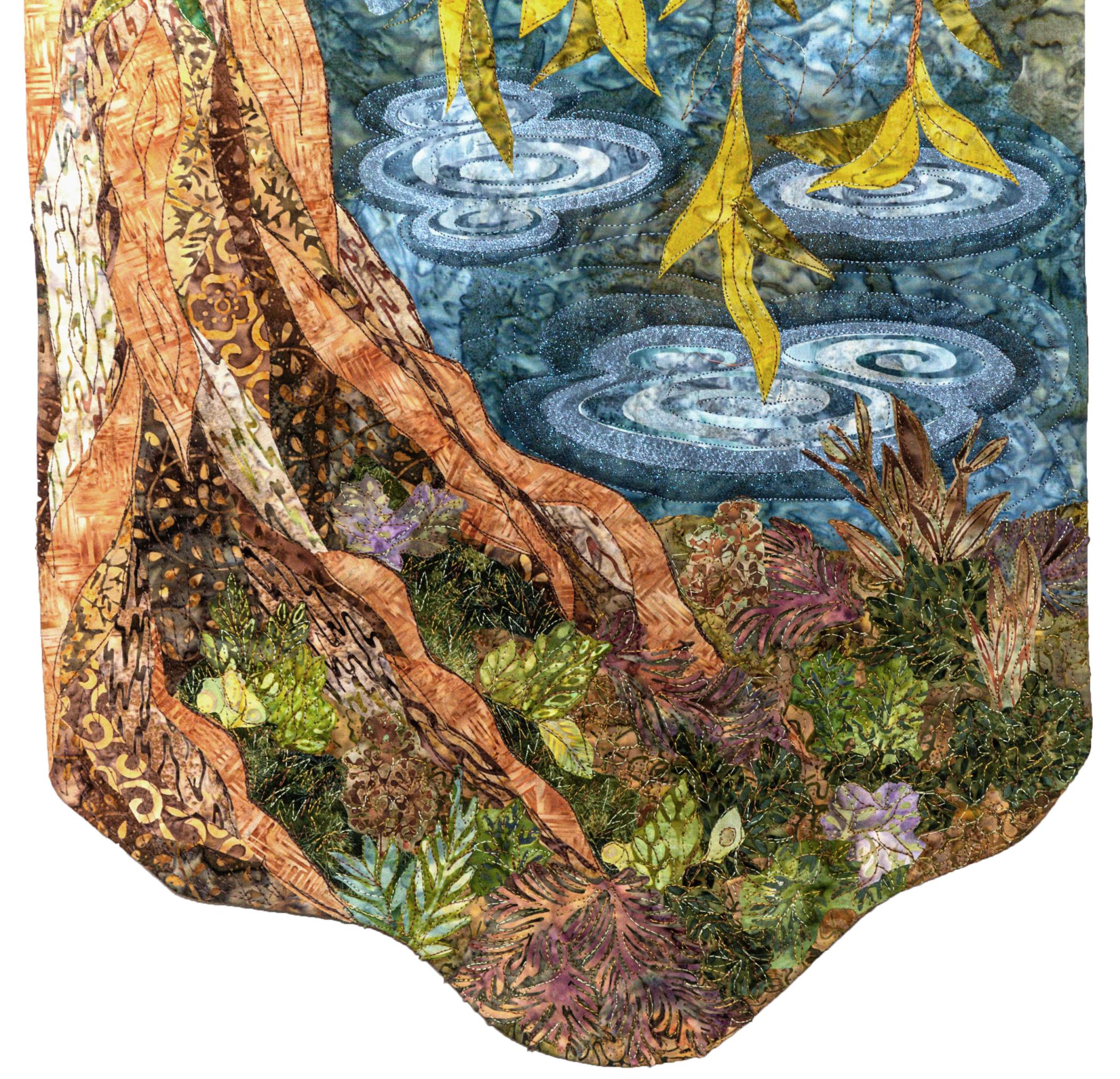 Twined, machine pieced, raw edge appliquéd, free motion quilted