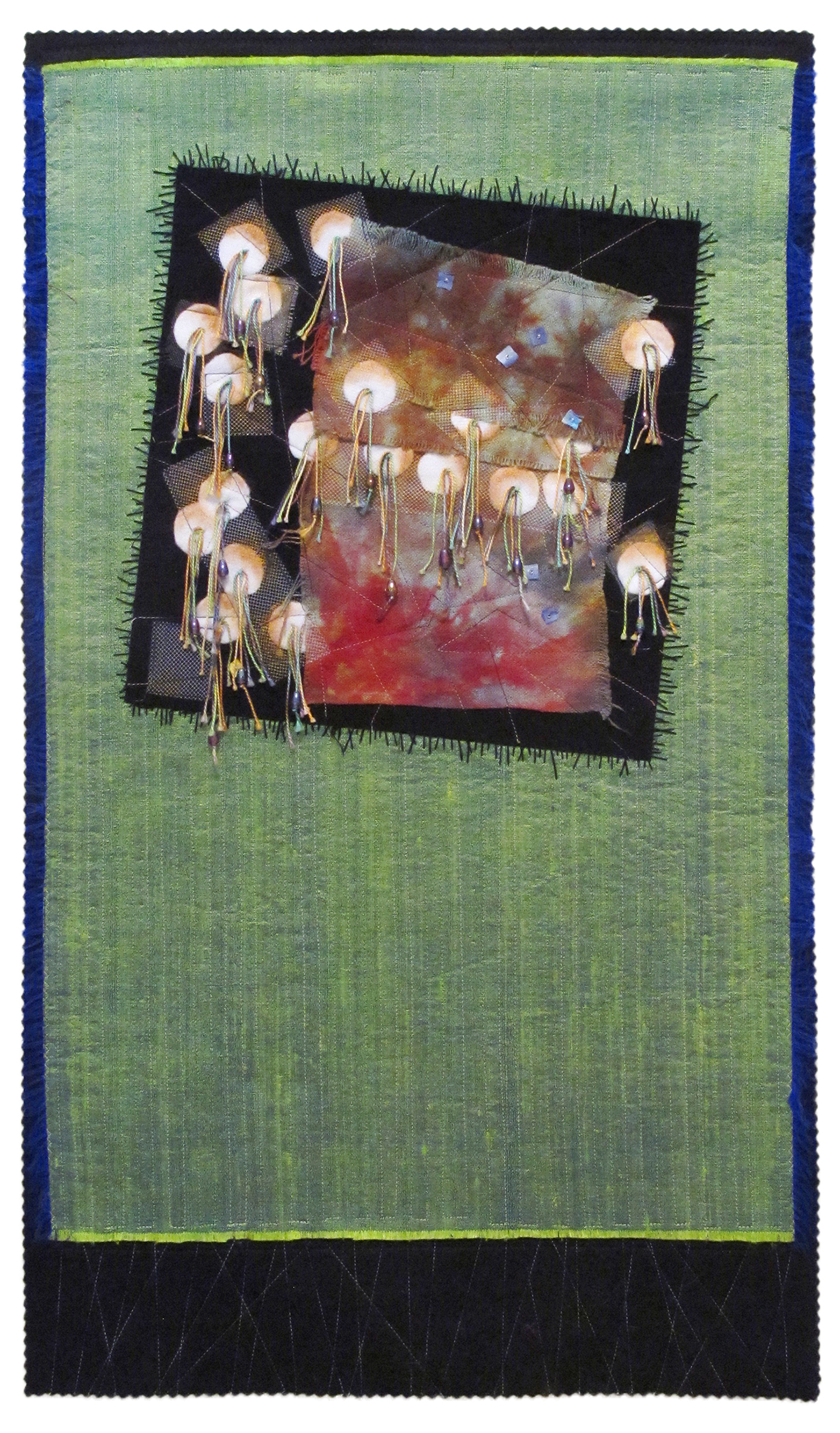 Silk, ice-dyed cotton, felt, netting, assorted threads, perle cotton, beads, metallic paint.