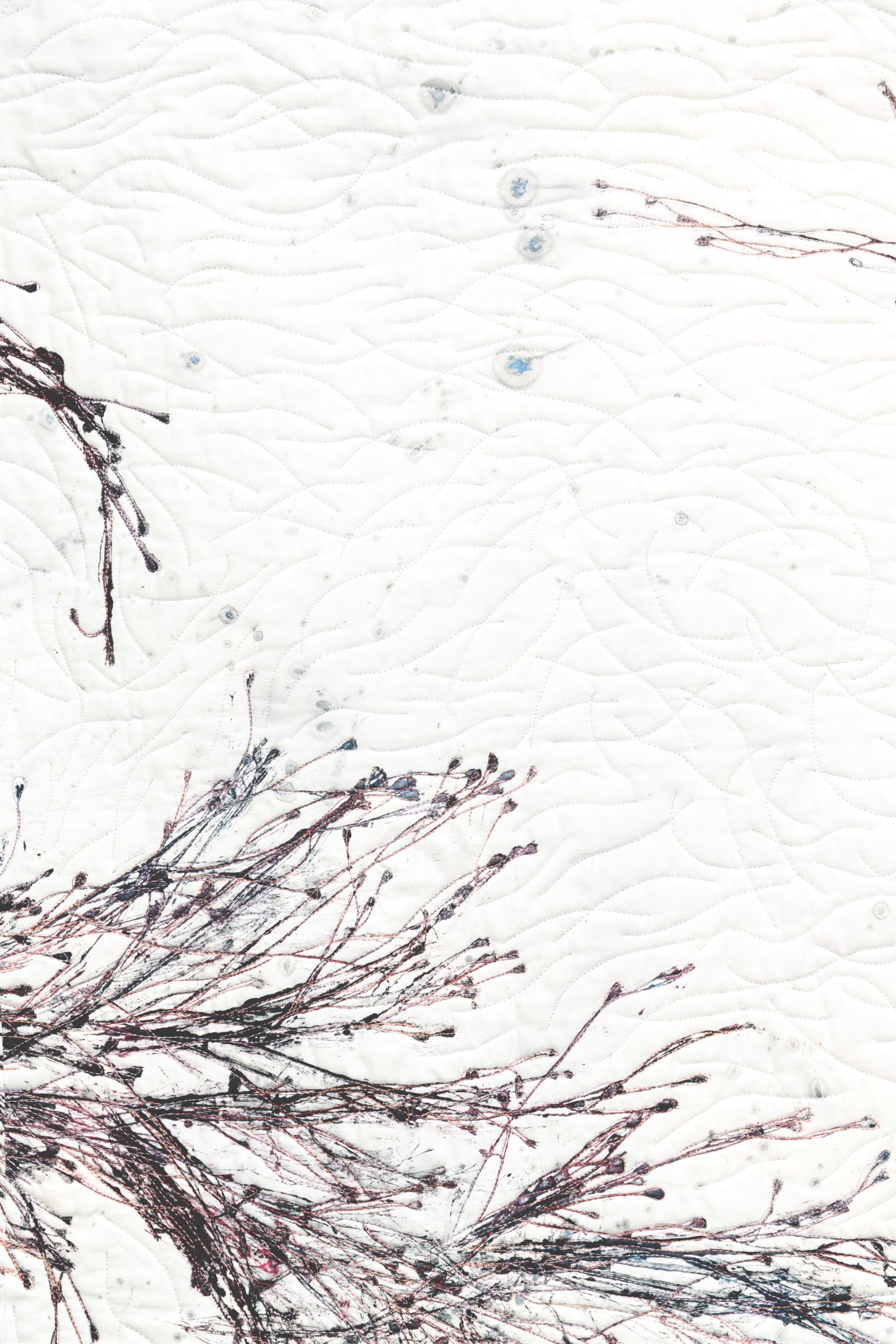 The wind howls as foliage is flung around in a tempest. I was intrigued by how I could best capture the awe-inspiring natural event of a storm using print and stitch in a very elemental form.