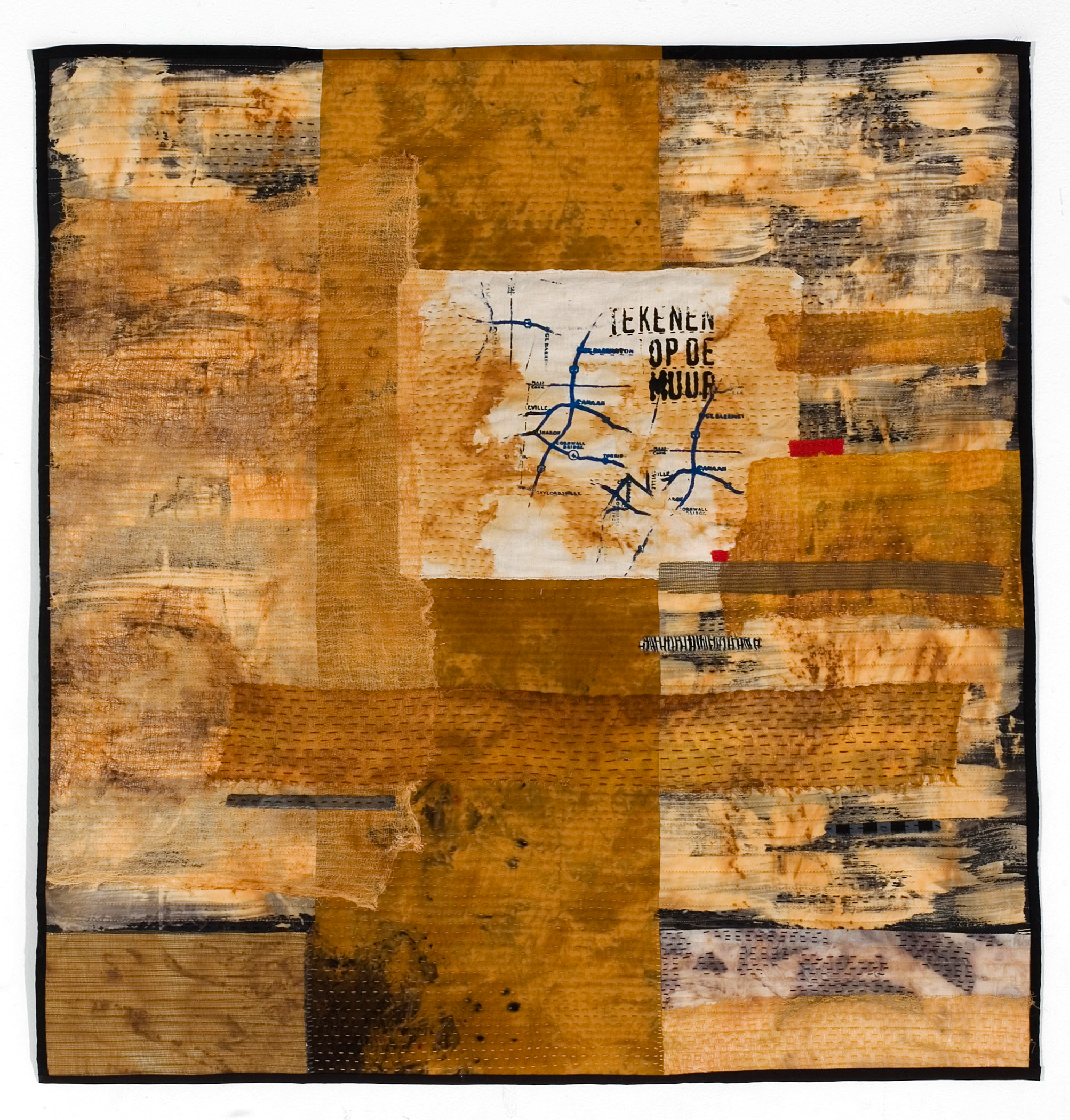 I am interested in the relationship between time, memory and imagery. When we moved from our 100 year old house on the Atlantic coast, I wanted to document this particular place and the time we had lived there. By rusting fabric with objects that I had found in the ground, I made historic imprints of the place. I feel that I transferred the memory of the time I had spent there to a tactile surface; capturing its DNA so to speak. The layering of materials and the rust imprints refer to the passage of time and the process of remembering.
