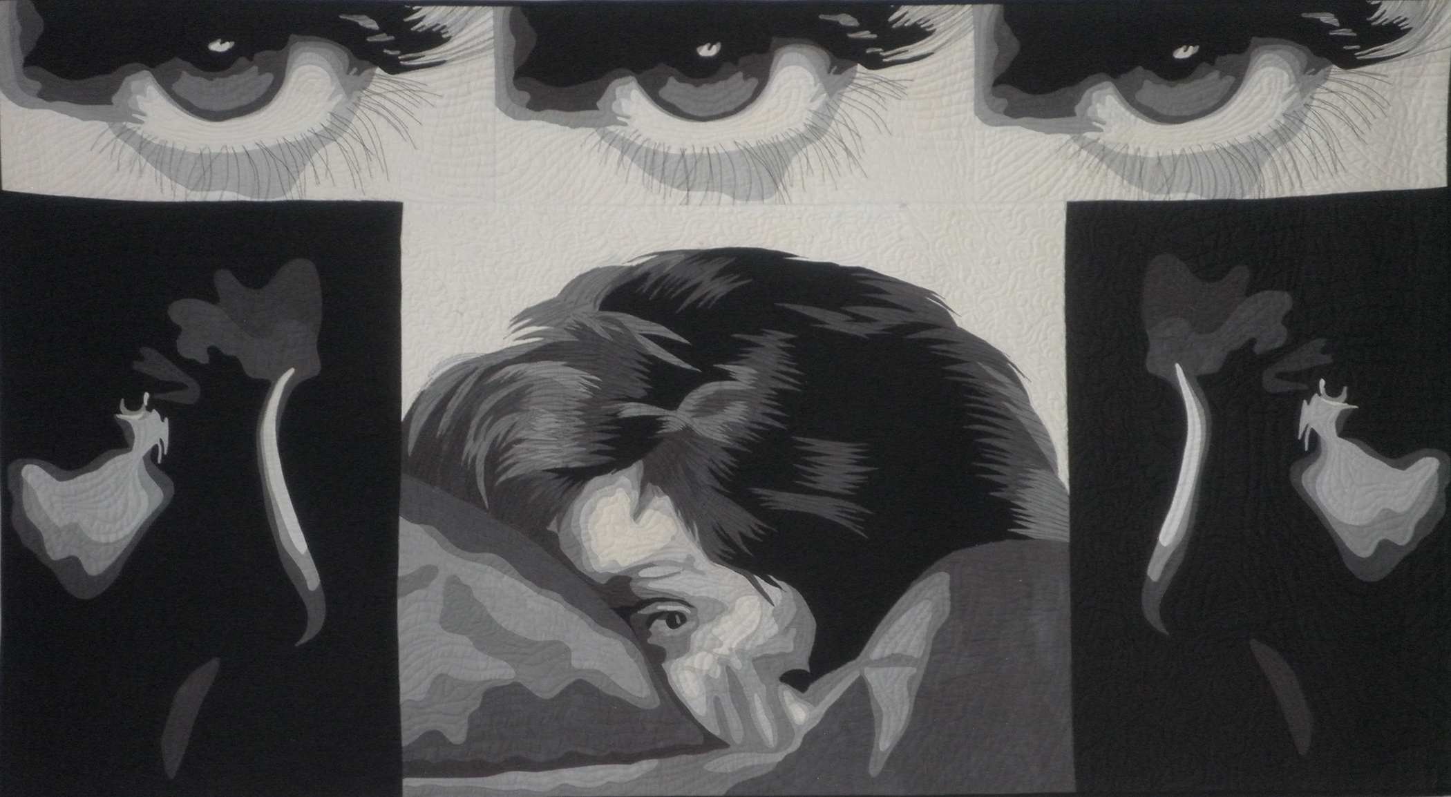 My own hand dyed fabrics, turned edge applique, raw edge applique, machine quilting. This is one of my first quilts that departed from traditional Baltimore Album applique and still one of my favorites.