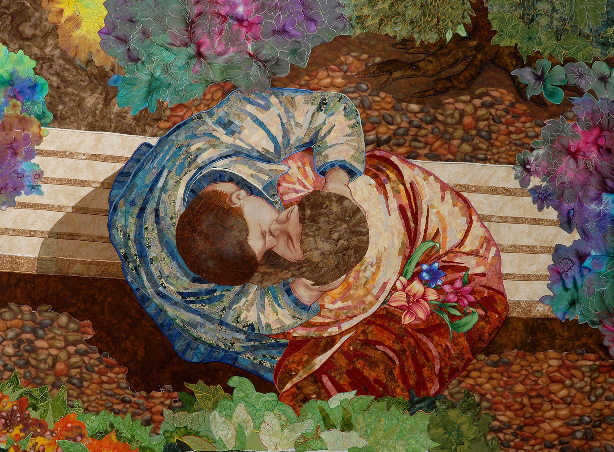 One day, while at the hairdresser’s, I was intrigued by an old photograph I saw in a magazine of two young people kissing, seen from above. Although the photo was taken during wartime, all you could see was the couple’s love. A few months later, I was moving into a new house and heard my dog bark. I went to the window and saw my son below in the garden kissing his girlfriend. I immediately thought of the photograph I’d seen in the magazine. I had to fix the moment in a quilt!
