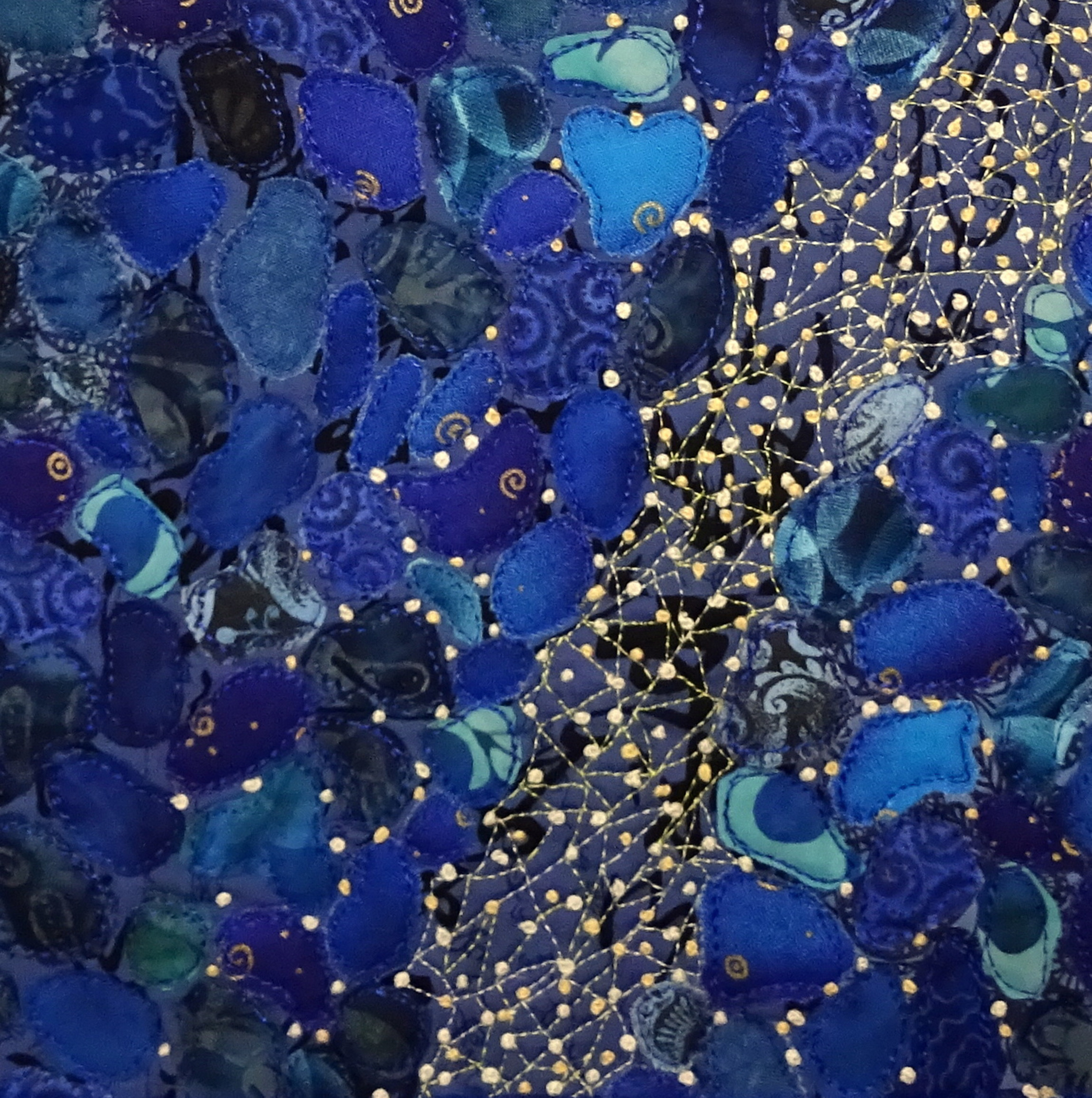 Materials: commercial fabrics, quilting thread, embroidery thread