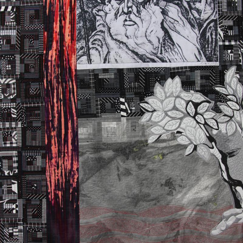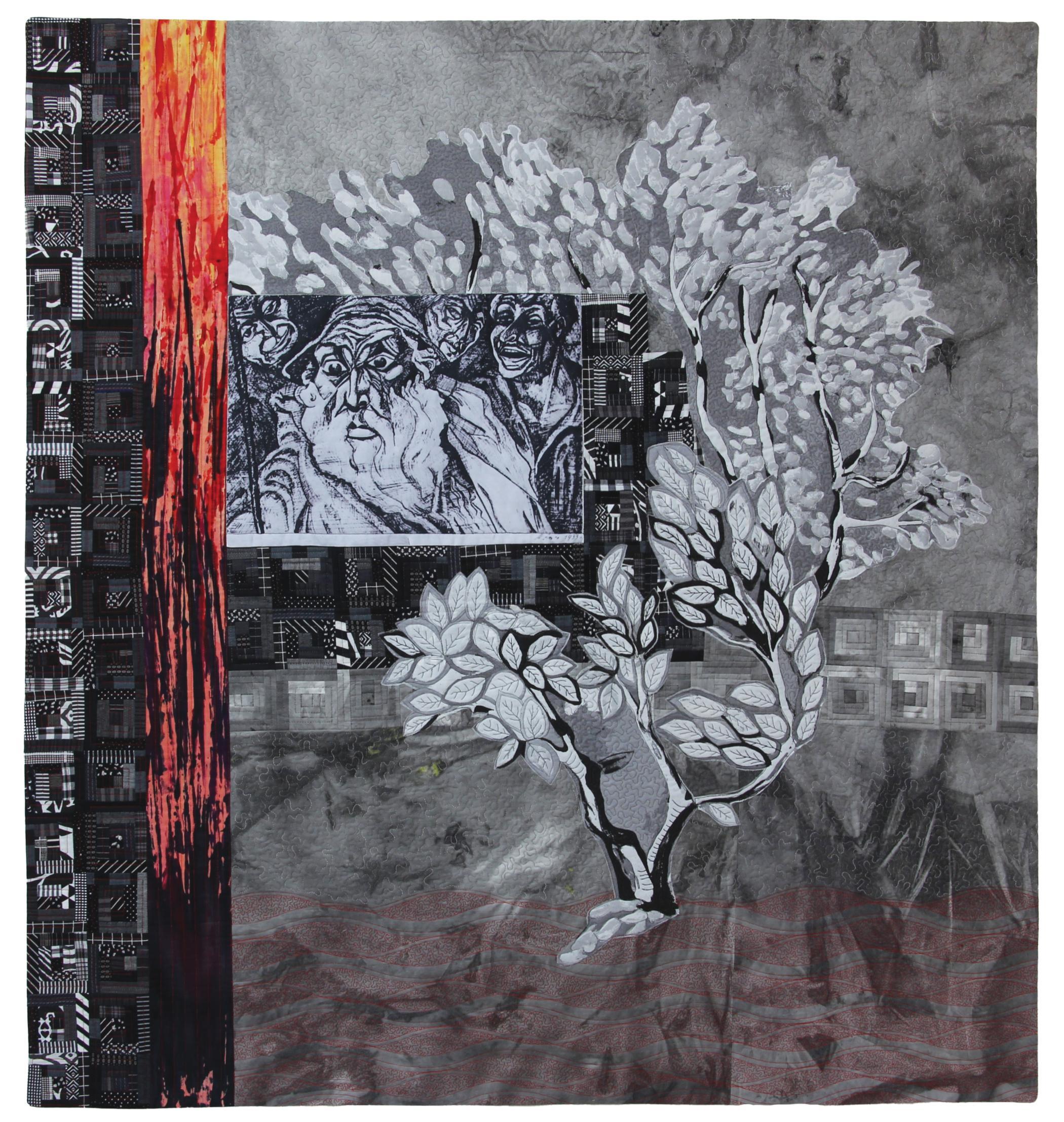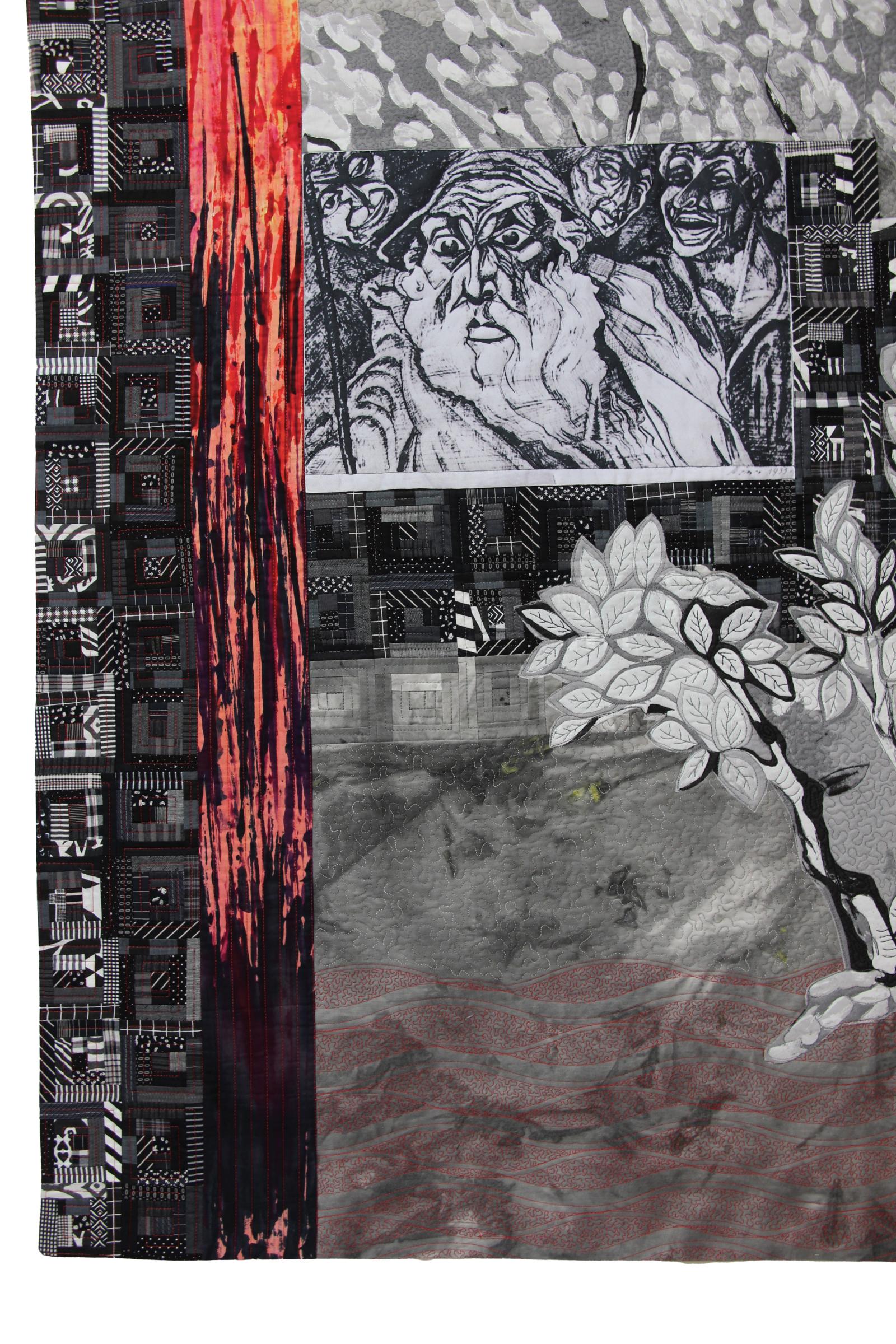 My quilt is a collaboration with my late uncle Meir Ader, who was murdered by the Germans in 1942 during the Holocaust. He had an extraordinary artistic talent. Thanks to the efforts of his school headmaster, he received a scholarship and was admitted to the School of Arts in Lublin. He graduated with honors. In 1933, my uncle presented an exhibition in Warsaw where, among others, his painting There is No Prophet in His Hometown was displayed. It was dated 1933, the year Hitler came to power. I assume he painted it following the political situation in Germany when anti-Semitism was on the rise. This photograph is the only memory my family has of my late uncle’s art. I printed it onto fabric and integrated it into my art quilt.