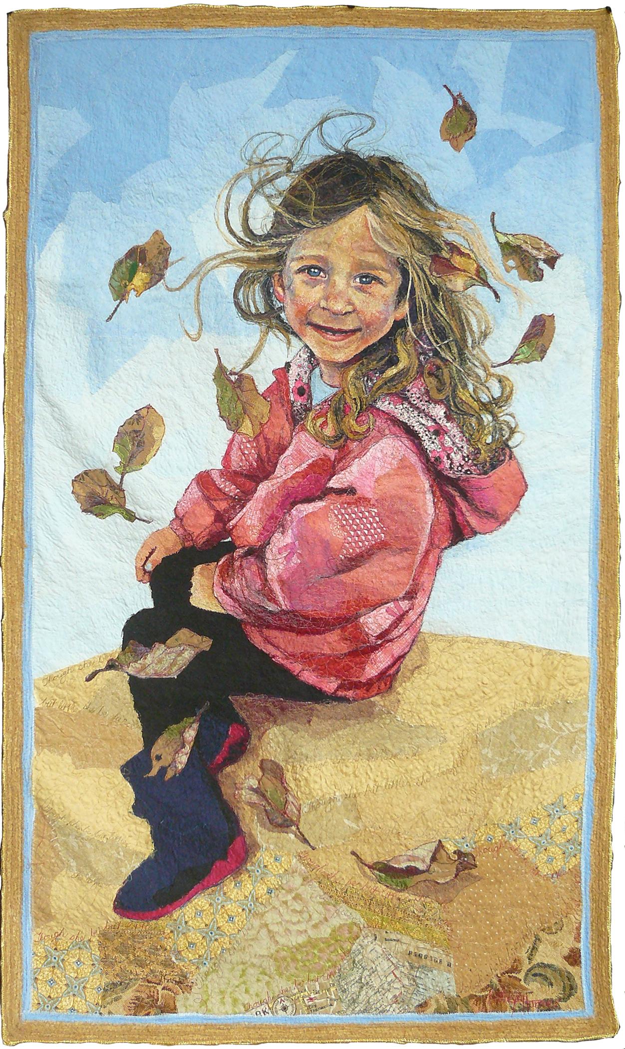 In one of the photographs which I used as a source for this commissioned portrait, this gorgeous, little poppet was gazing happily back at the viewer whilst the wind spiralled strands of her hair around her face. I decided to add the frame of tumbling leaves to emphasise the vitality of her engaging expression. Her thumb nail is painted pale, sky-blue, hinting at a quirky playfulness.
