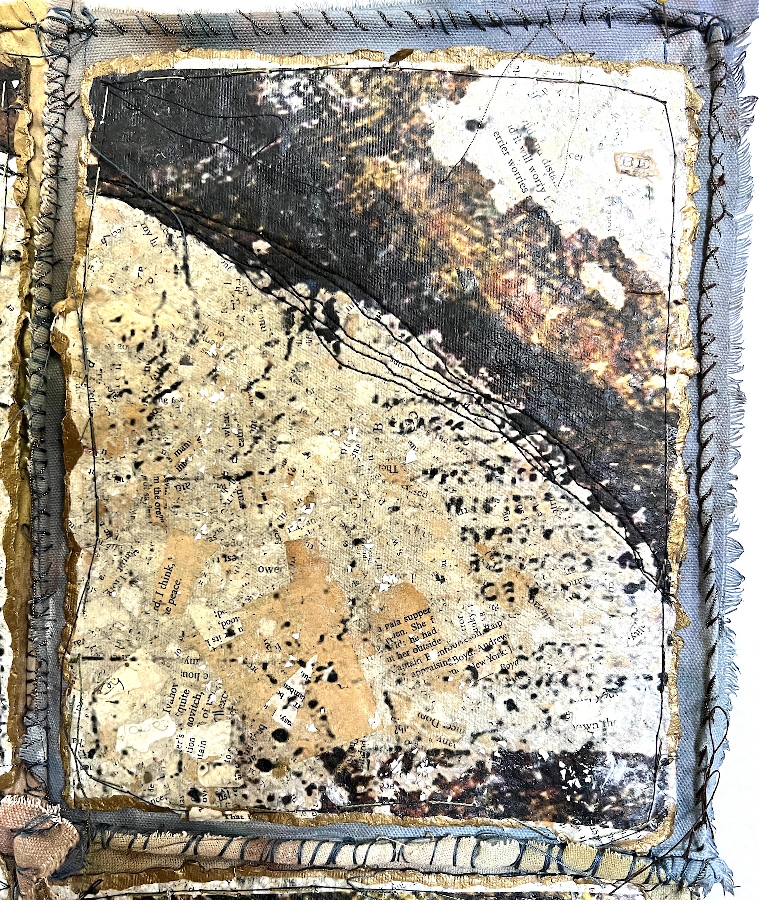 Embedded Handmade paper with digital grounds & printed with an original image. Each section sewn onto hand painted fabrics & stitched right side out.