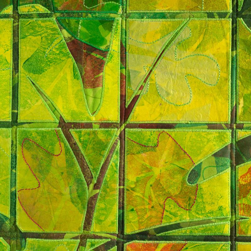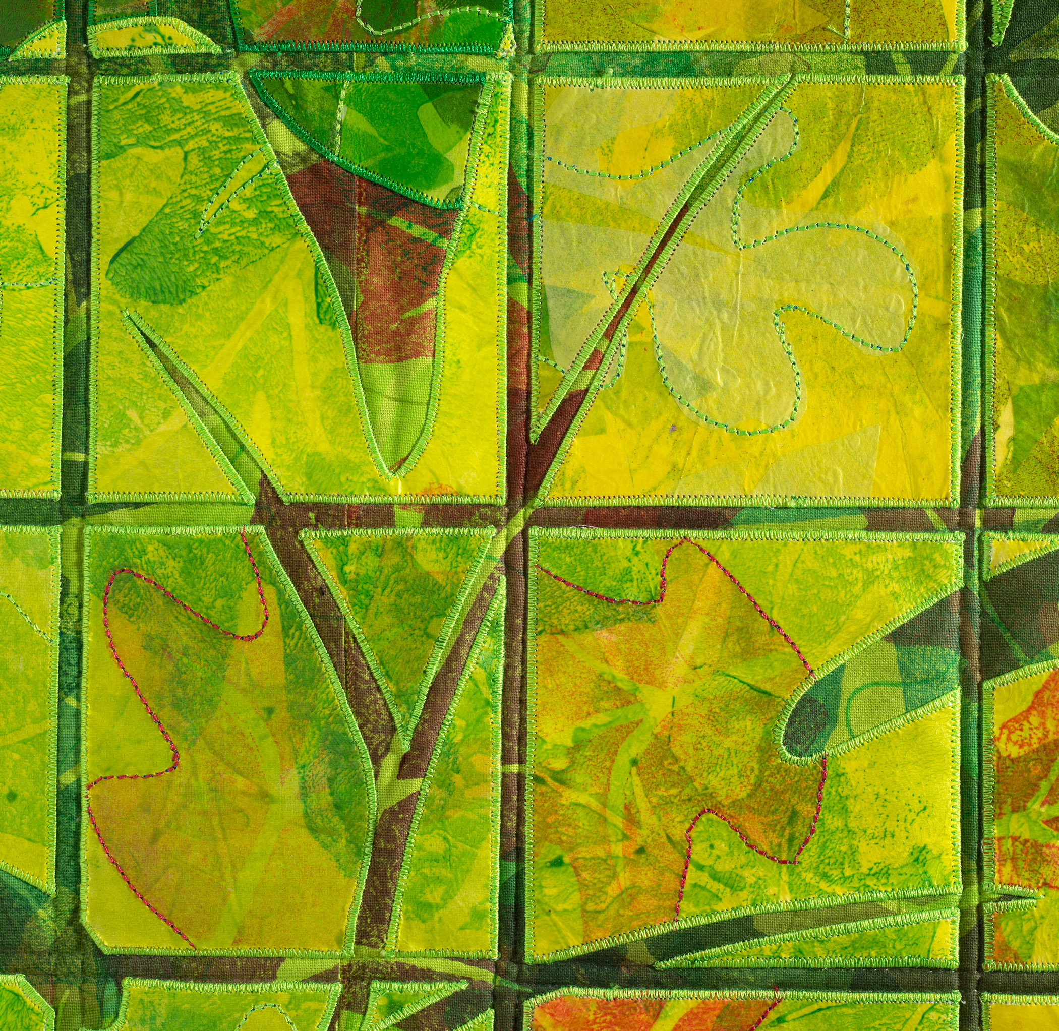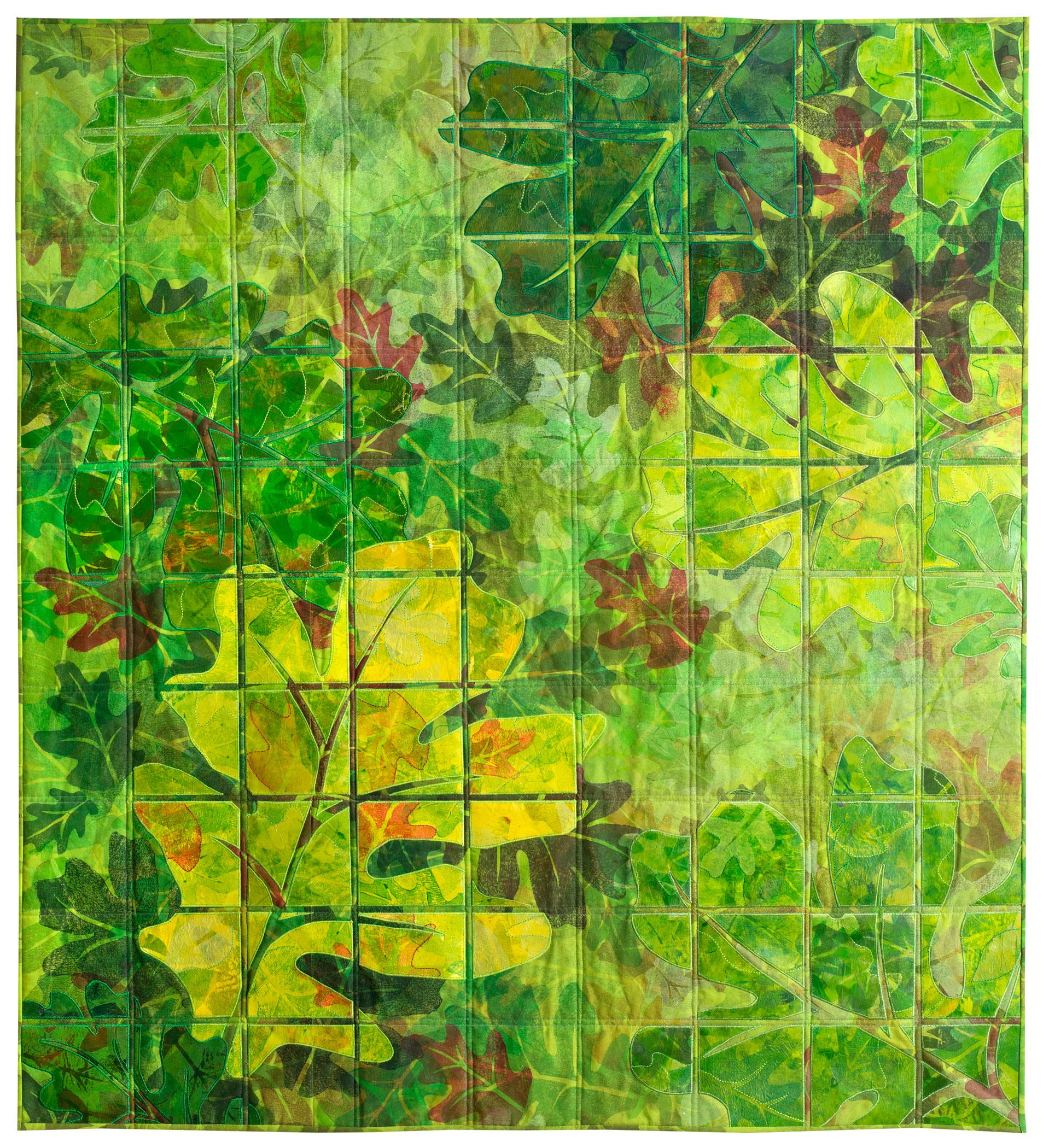 My work explores ways in which juxtapositions of value and color interact to determine what can be seen. My current Through the Canopy series evokes light from the sky filtered through a broken canopy of leaves. Large oak leaves created from appliquéd blocks of painted, stitched, and collaged rice paper hover over a background stamped with smaller leaves. The implied sashing disappears and reappears across the surface of the quilt.