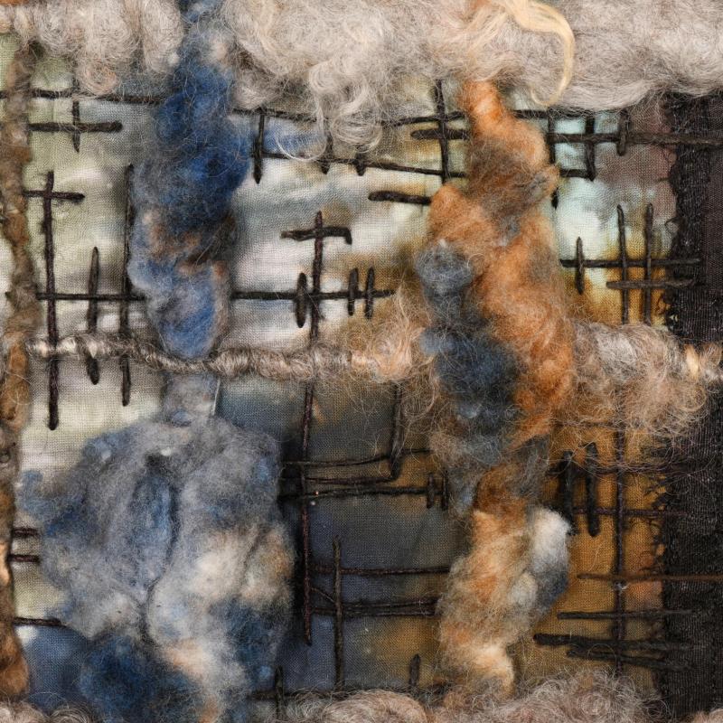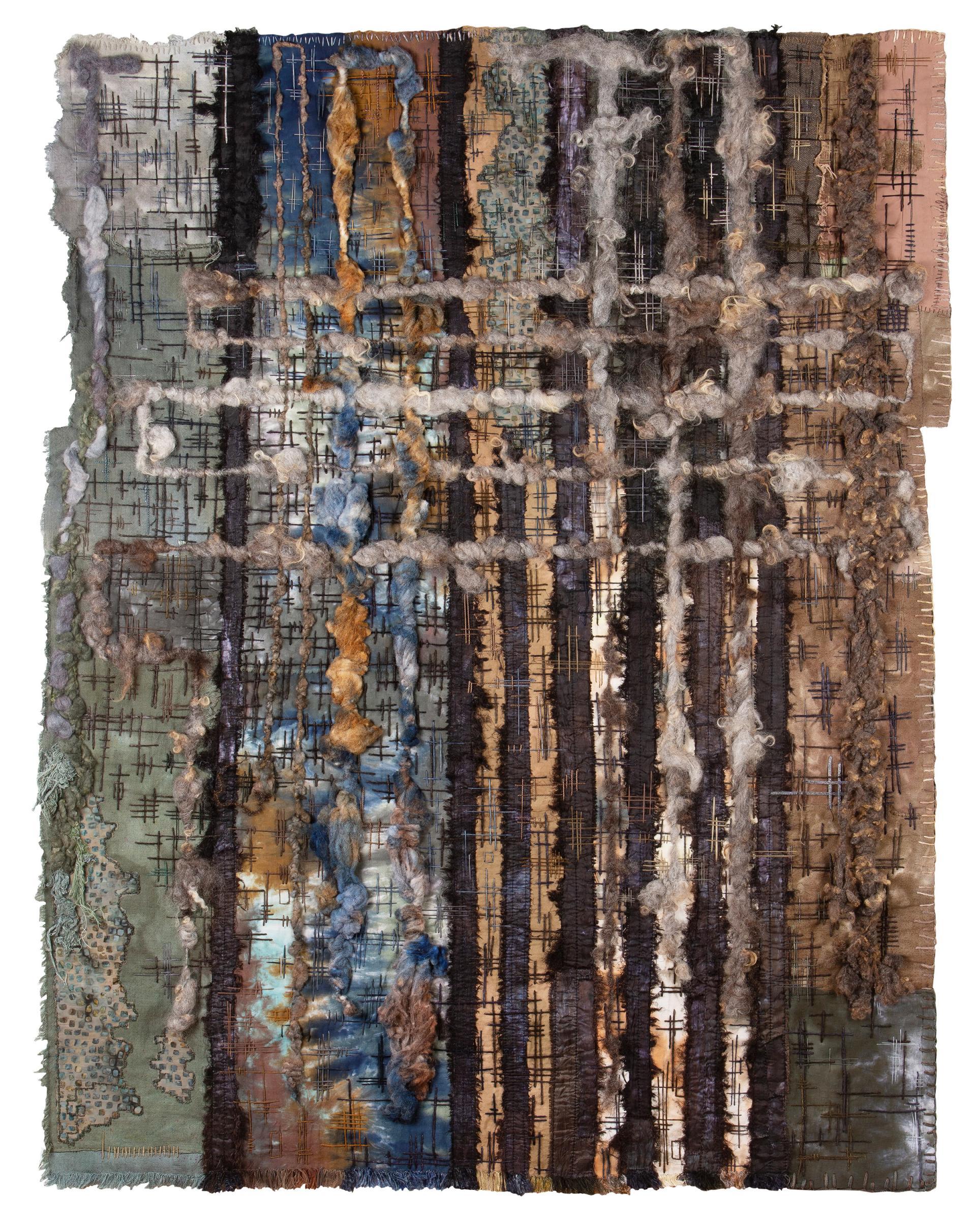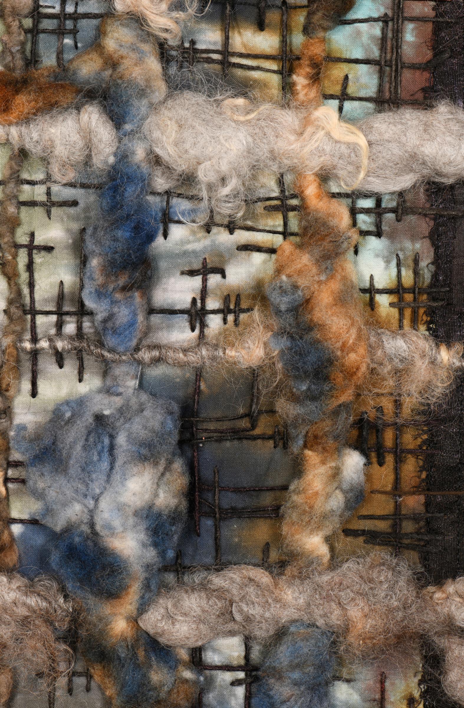The softness of spun wool yarn is juxtaposed with strong, straight silk stitches. Wool and silk are the natural fibers of the earth. Grief against joy. Emotions travel down and up, in and out, leaving the viewer to ask, what happens now?