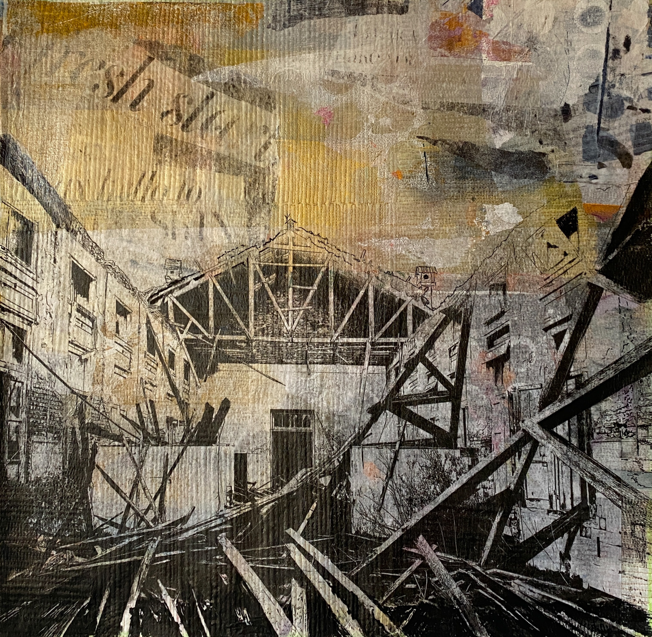 My work has focused on old, decaying buildings. Structures that show the ravages of time. Weathered wood, rusted metal, peeling paint. The work takes on various shapes and forms to draw the viewer in. The layered elements are used to give the impression of time passing, buildings deteriorating, disappearing slowly to make room for the new.