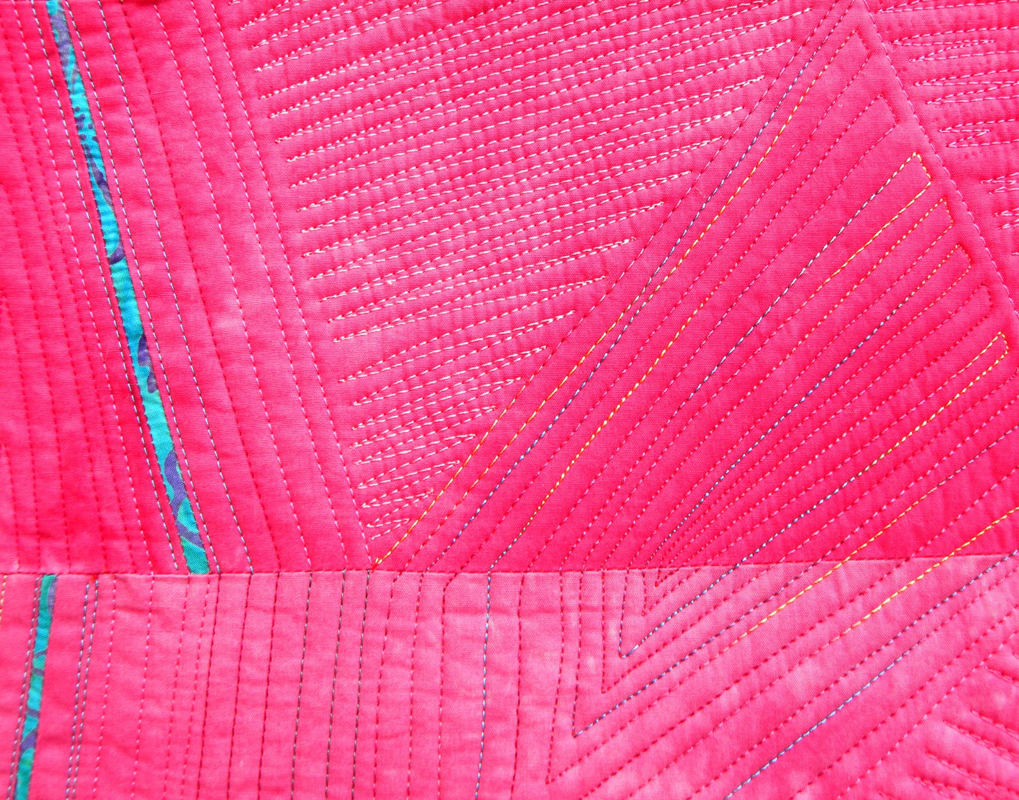 I inserted very thin lines into hand-dyed fabric strips to symbolize my sensory experience with Tinnitus. The irregular quilting lines further express the discomfort and irritation associated with my hearing condition.