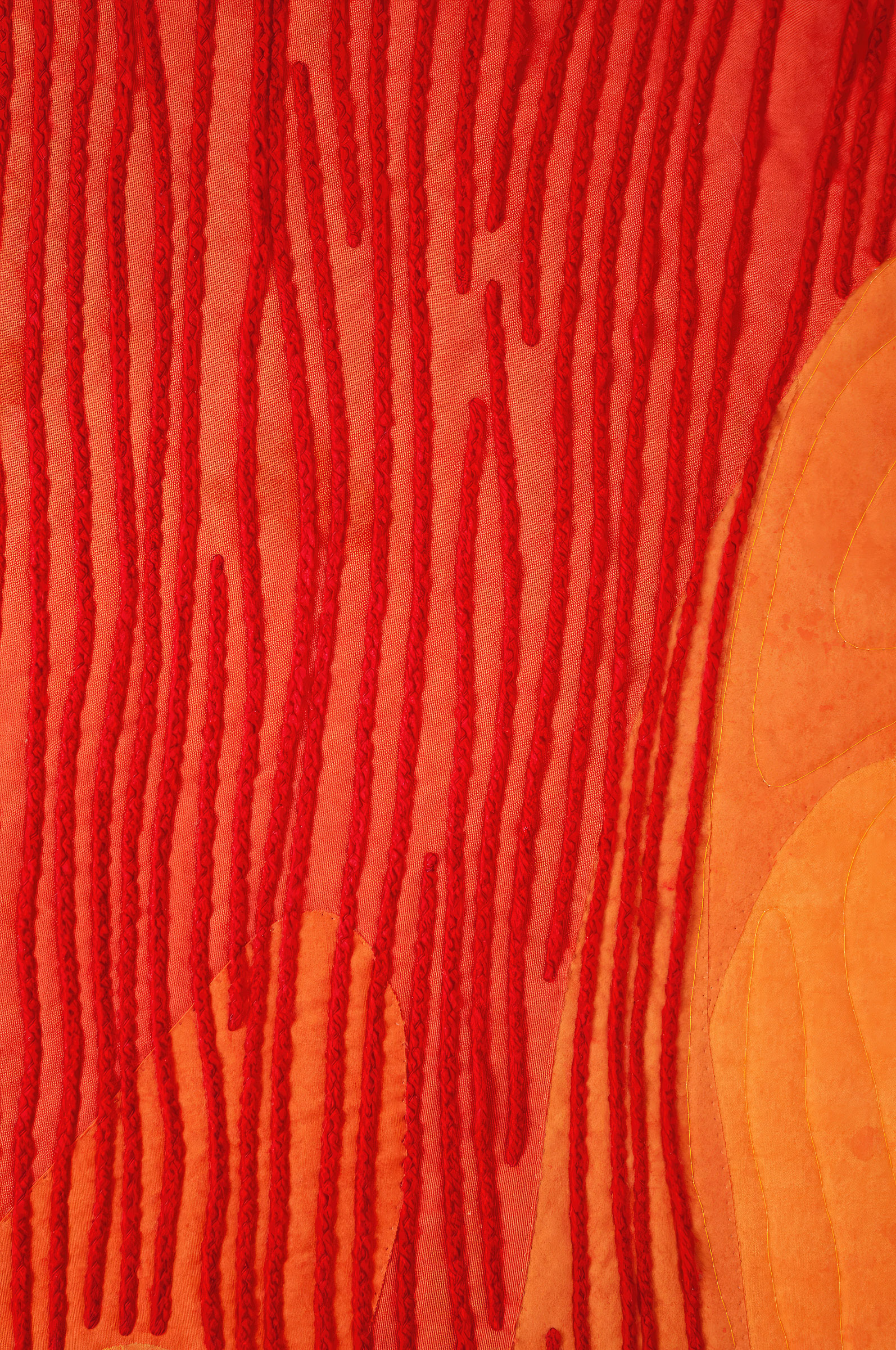 This artwork is based on a synthetic-aperture radar (SAR) image from Cassini’s Titan Radar Mapper. It was taken on June 21, 2011, as part of the Cassini-Huygens Mission, a cooperative project of NASA, the European Space Agency, and the Italian Space Agency. Titan is Saturn’s largest moon and several surface features are represented in this piece. The Ksa crater is rendered in the upper left corner. The red lines represent the linear dunes on the surface of the moon. The lighter sections on the right and lower left illustrate part of the area referred to as Xanadu, a large feature centered near the moon’s equator. In my orientation of the artwork, North is to the left.