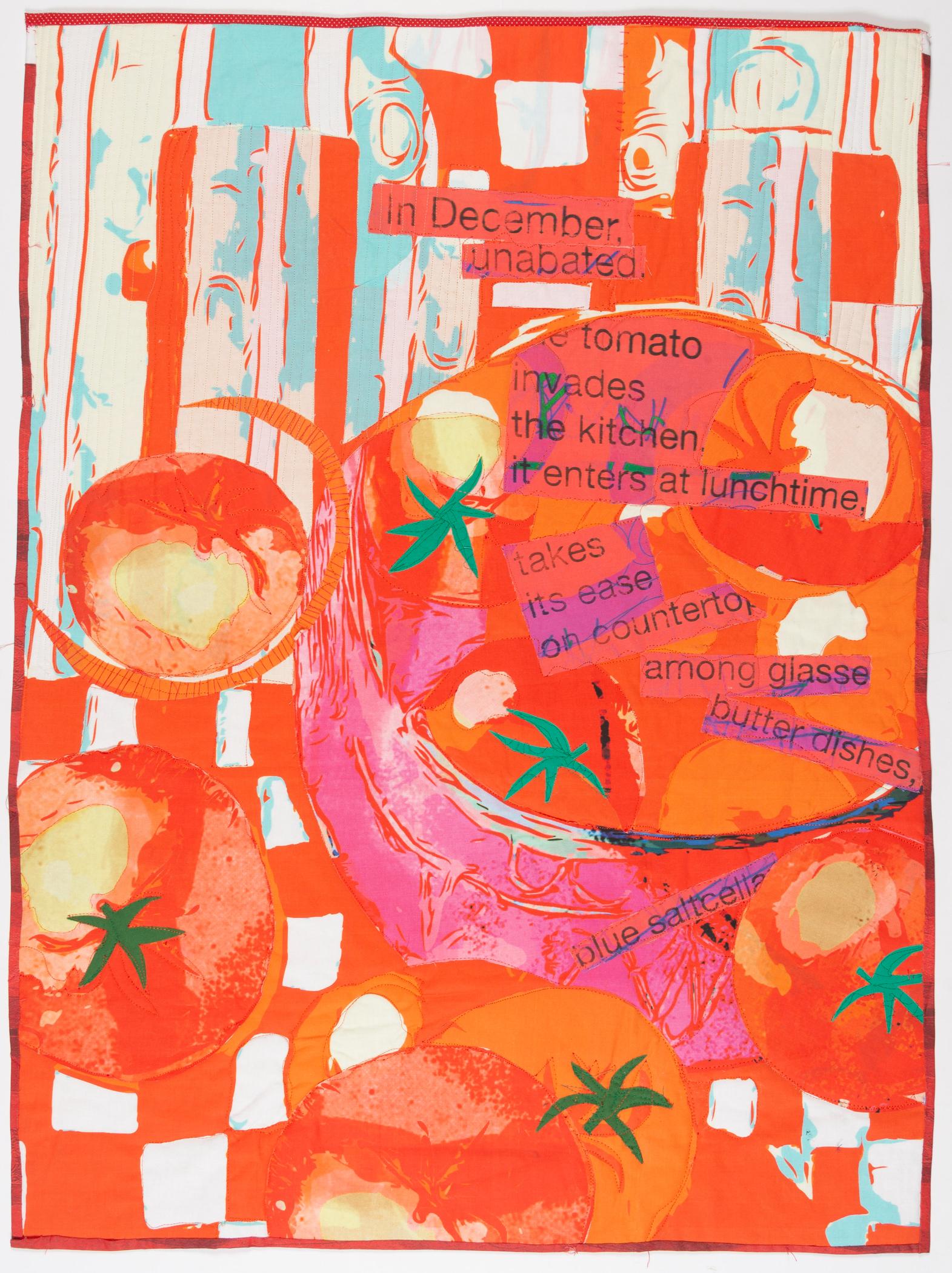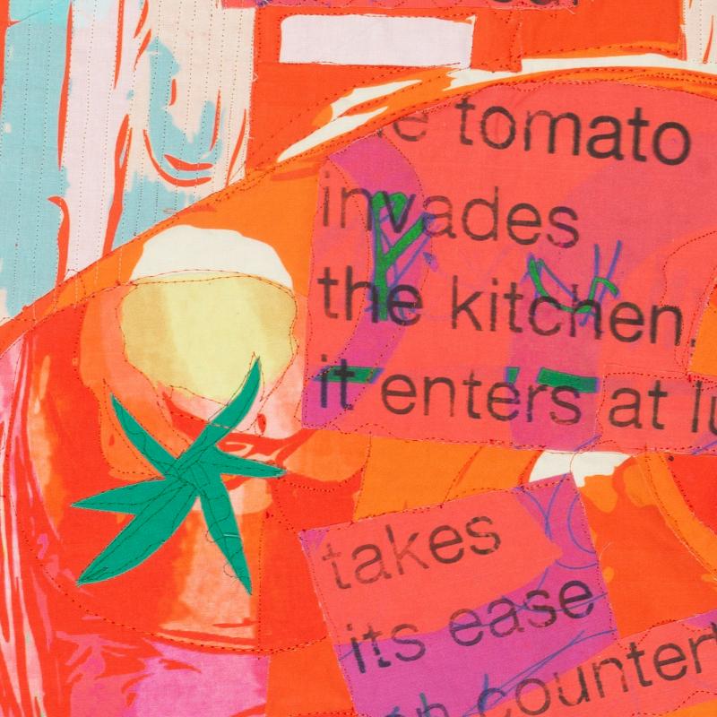 Chilean poet Pablo Neruda wrote one of his odes as a homage to the tomato—invading the kitchen and cavorting with salt cellars and olive oil. This art quilt is one from a series based on this ode and my experiences visiting the markets of Latin America.
