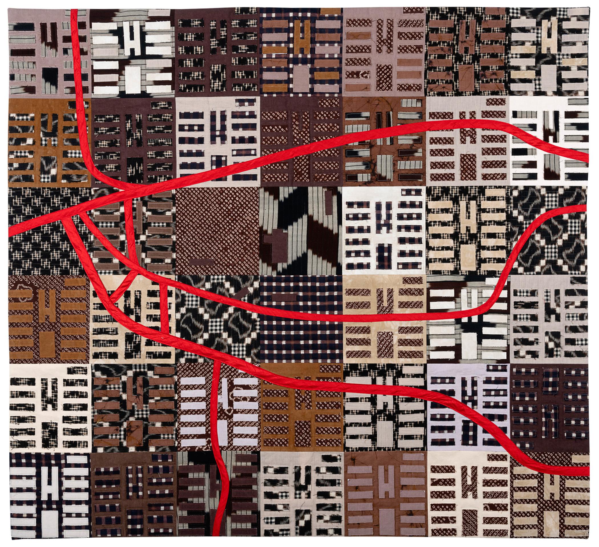The red lines reference the Japanese idea of kintsugi, which treats breakage and repair as part of the history of an object, rather than as something to disguise. The red lines represent how the Japanese internees’ lives were indelibly shattered when they were imprisoned in the camps, and their resilience in the struggle to put their lives back together after they were released.
