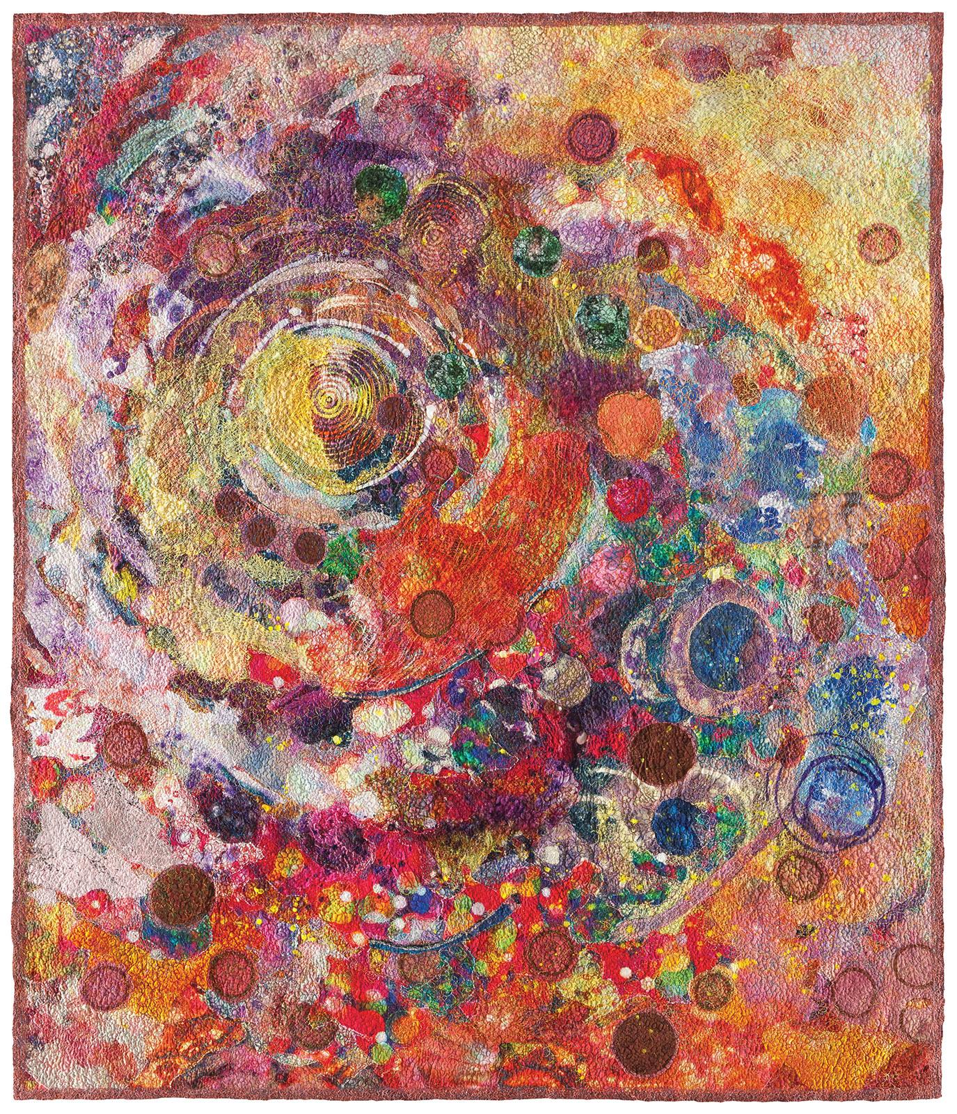 Raw edge appliquéd, free motion quilted, ice dyed, painted