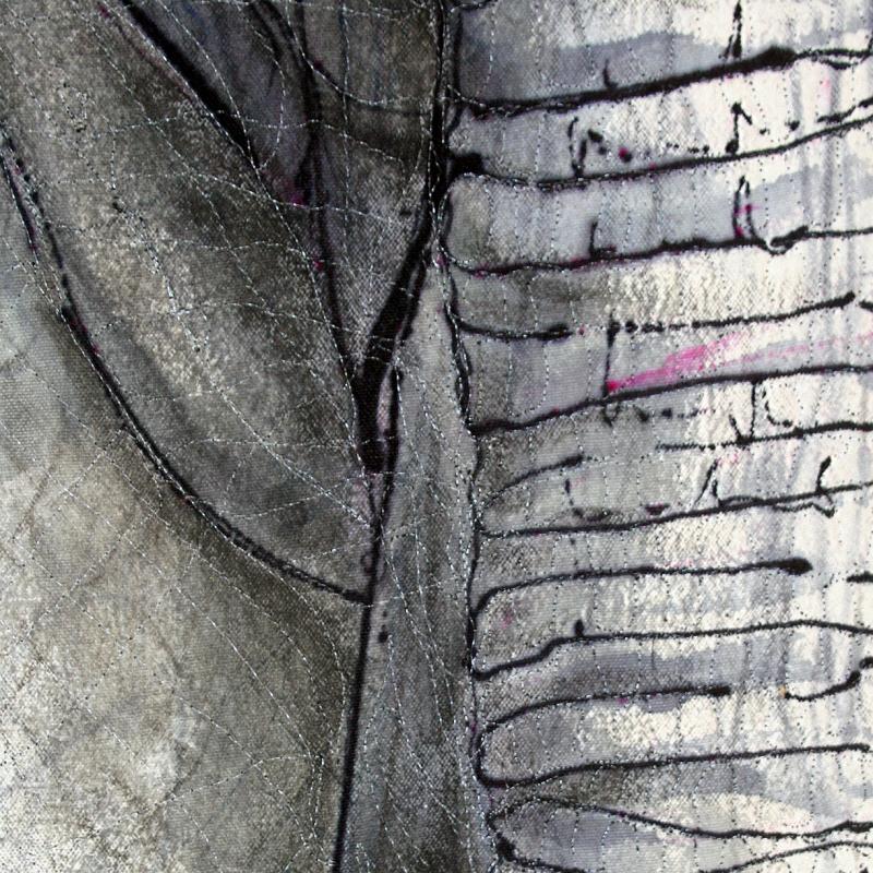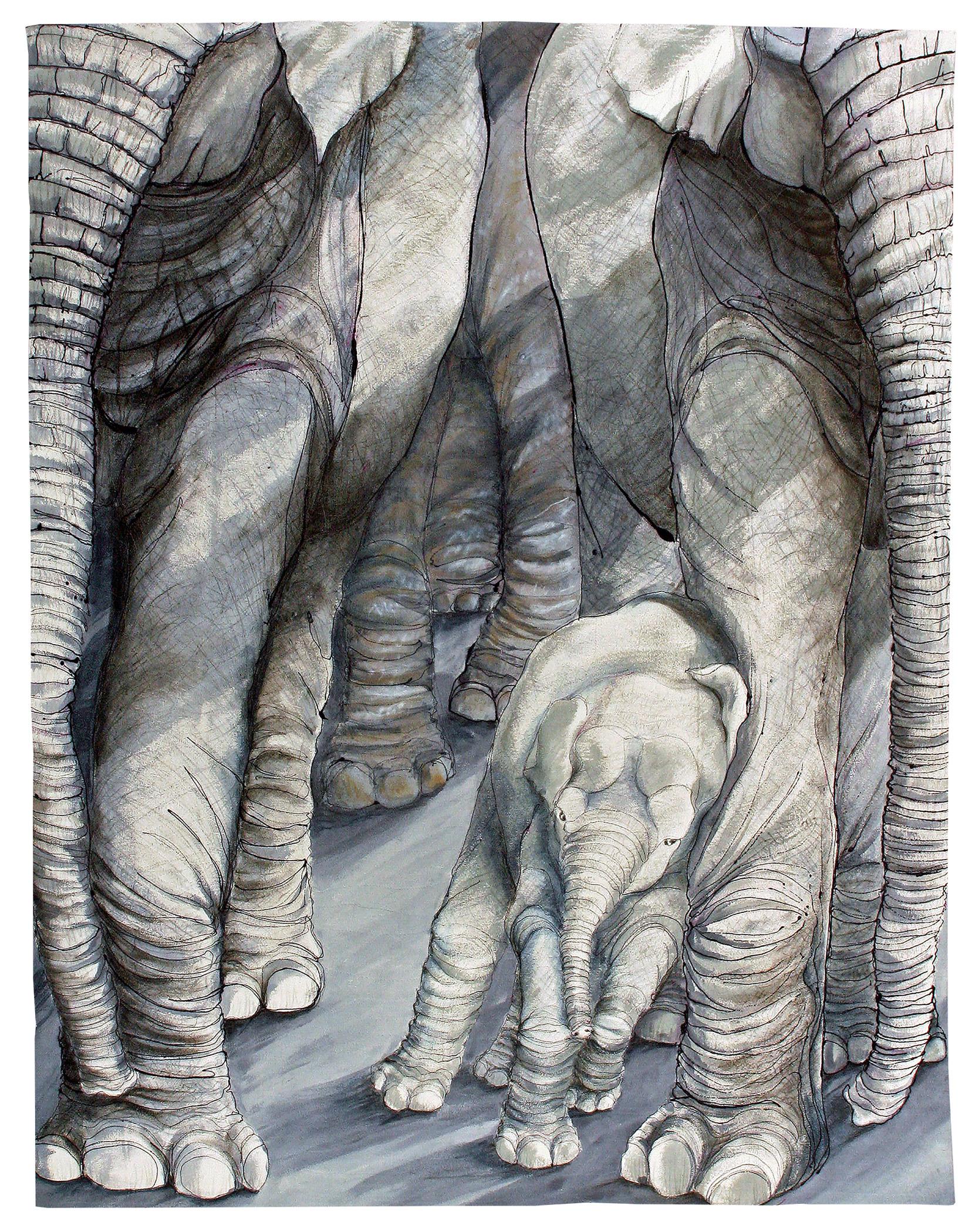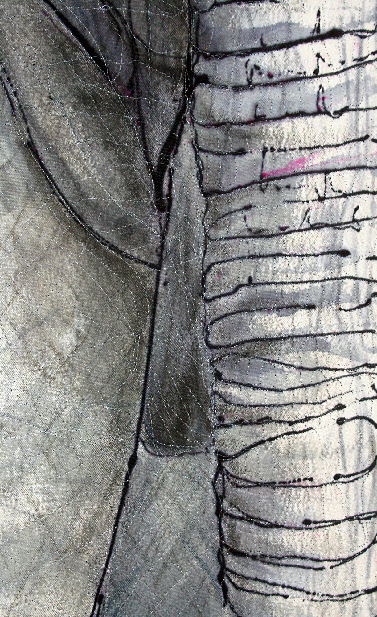 These Asian elephants are part of my Vanishing Species series. Elephants are famous for their close family bonding and the difficulty of their lifestyle in the wild. I wanted to allow the viewer to see the world from the baby elephant’s perspective, and to that end the piece is true to the full scale of Asian elephants. The extensive free motion quilting creates an elephant skin texture throughout.