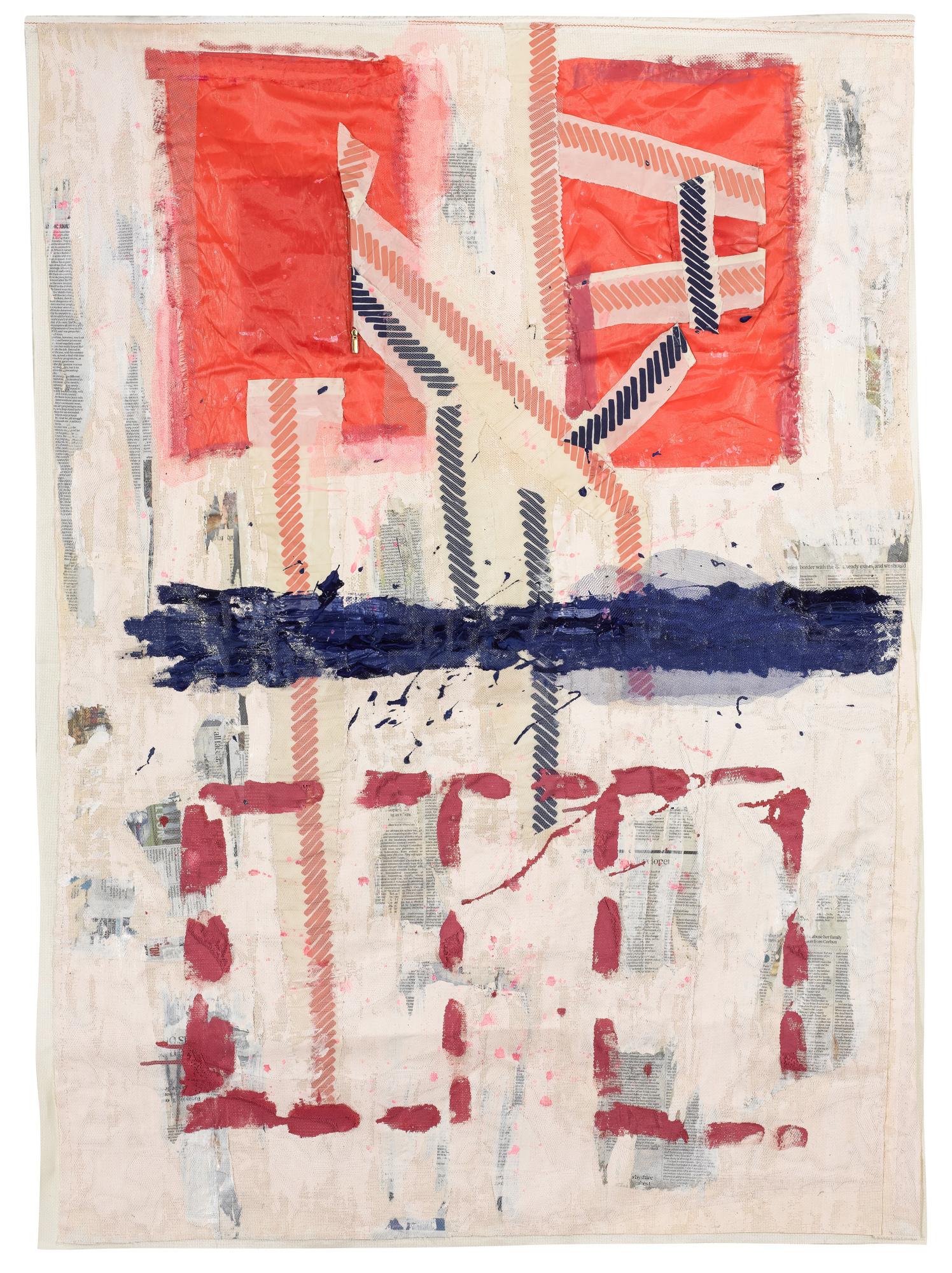 Three layers of fabric, acrylic paint, and pieces of newspaper.