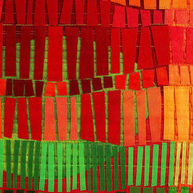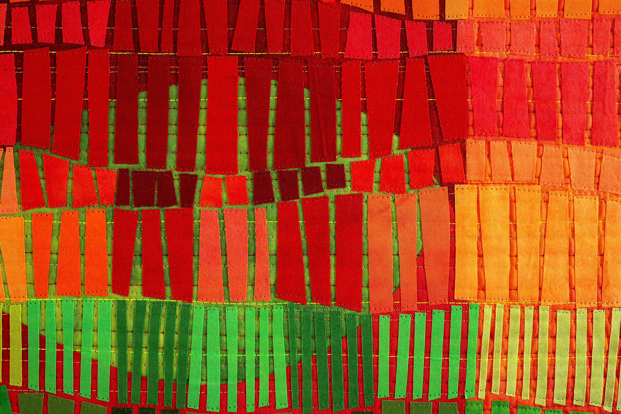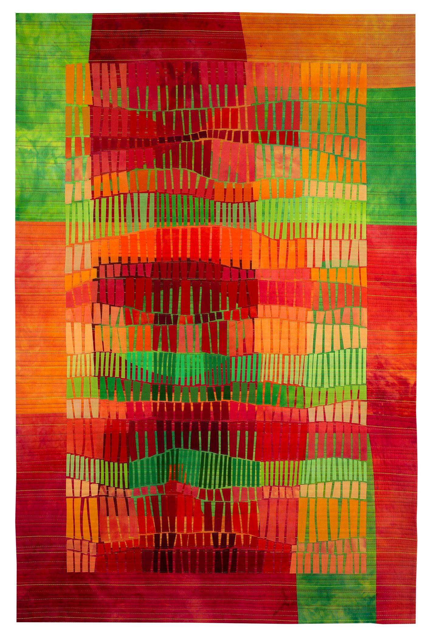 The production of textiles requires an enormous amount of water and energy, involving the use of many kinds of chemicals. To reduce my own footprint, I have begun transforming quilts I made in the past. In this piece, small rectangles of fabric were fused onto an older quilt and stitched in place. I like to integrate the new elements into the older quilt so that the past is visible in the new image. Will our planet’s past still be visible through the transformative changes we are making to its very fabric?