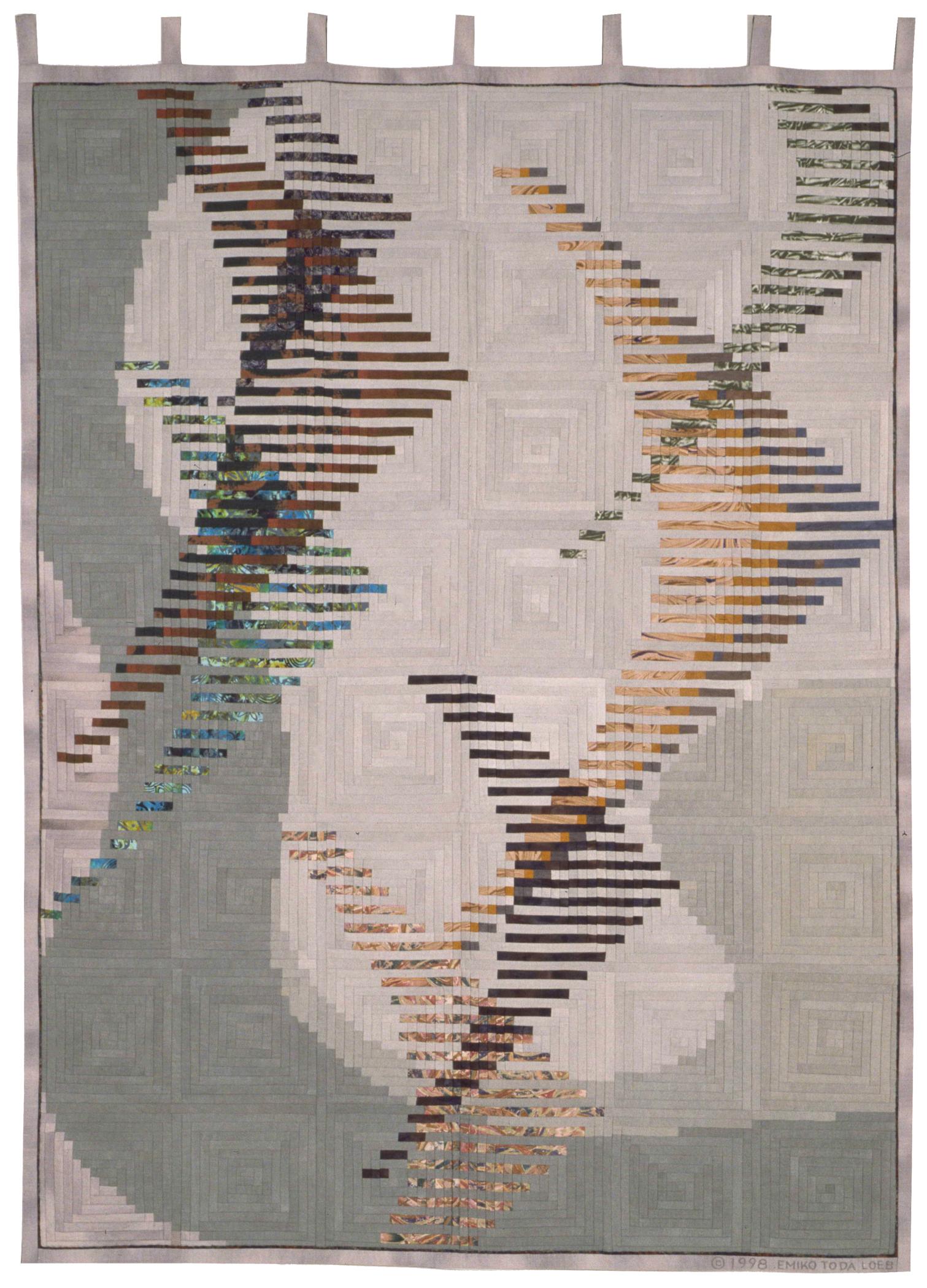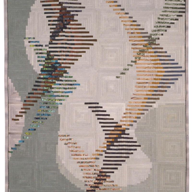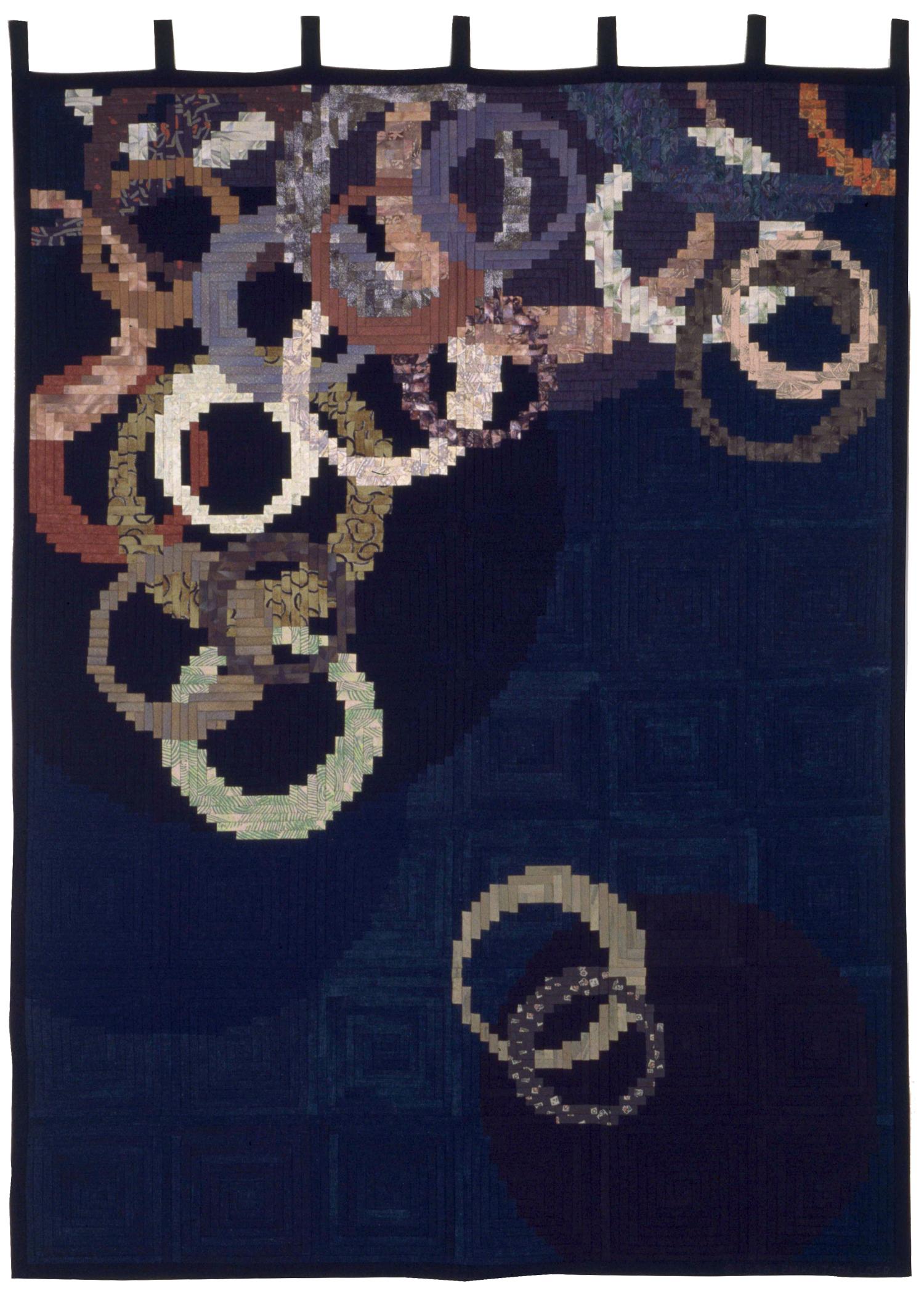 When making Comfortable Echoes (one year earlier) I found I could make circular patterns within the Log Cabin technique. I applied this technique here to create smaller circles, which could represent oxygen bubbles against a water background. For these bubbles I used five kimono samples which had been given to me, adding other fabrics to match.