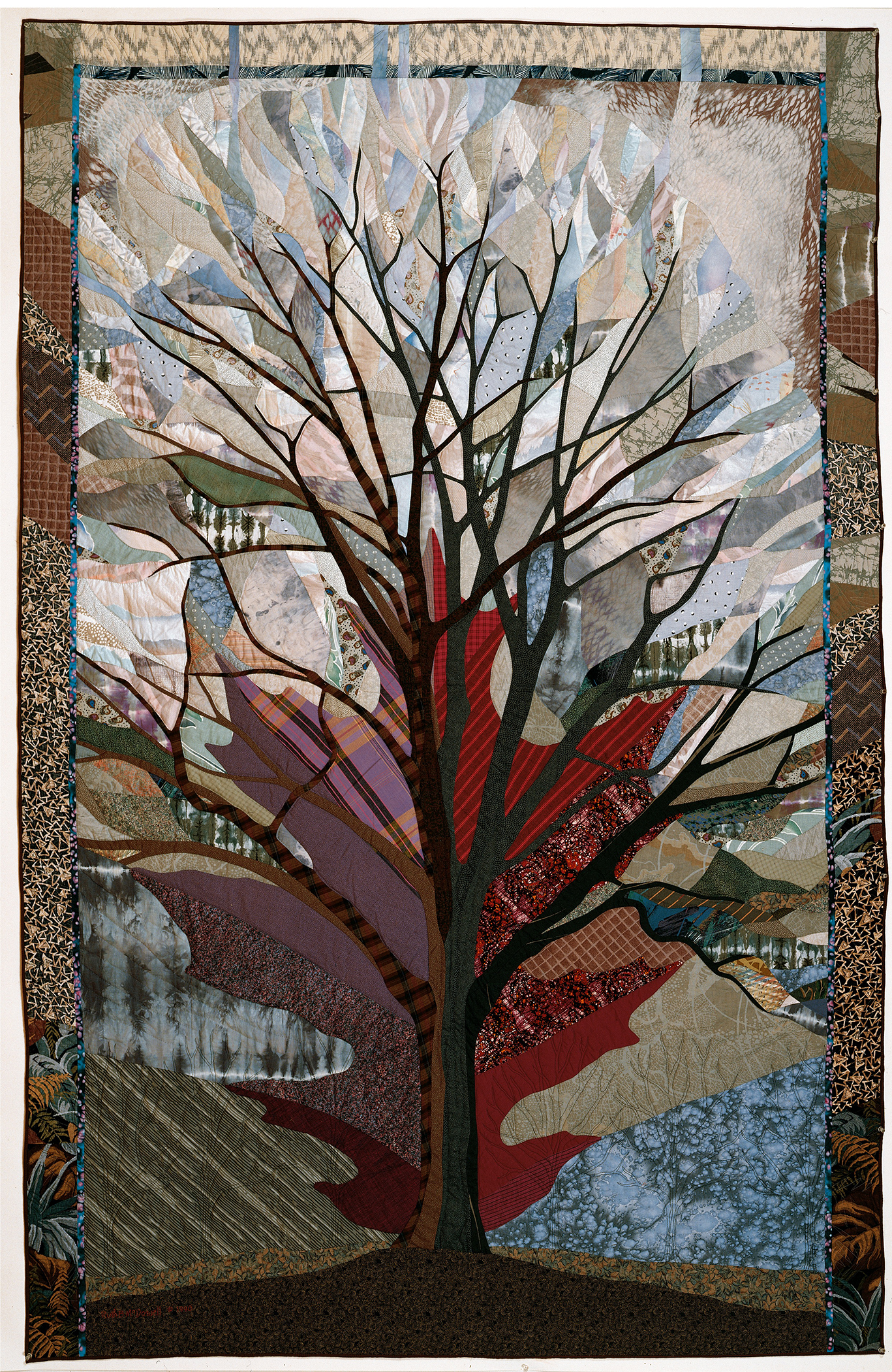 One of many Tree of Life quilts I have made using many different species of trees, this one includes an enormously oversized leaf behind the tree, all pieced at once. There are geometric parallels in a single plant between the angles in the leaf veins and the angles of the branches of the tree. Piecing such a tree allow me to change the background fabrics on each side of each branch. The smallest branches are simply represented by a seam line between two different background fabrics.