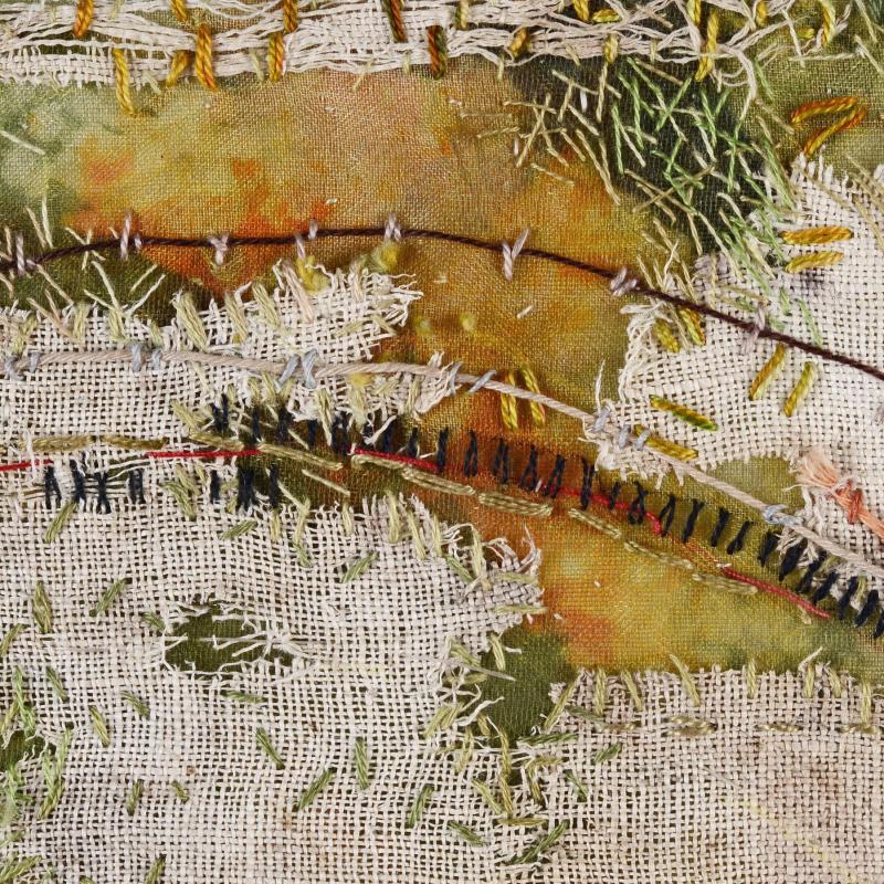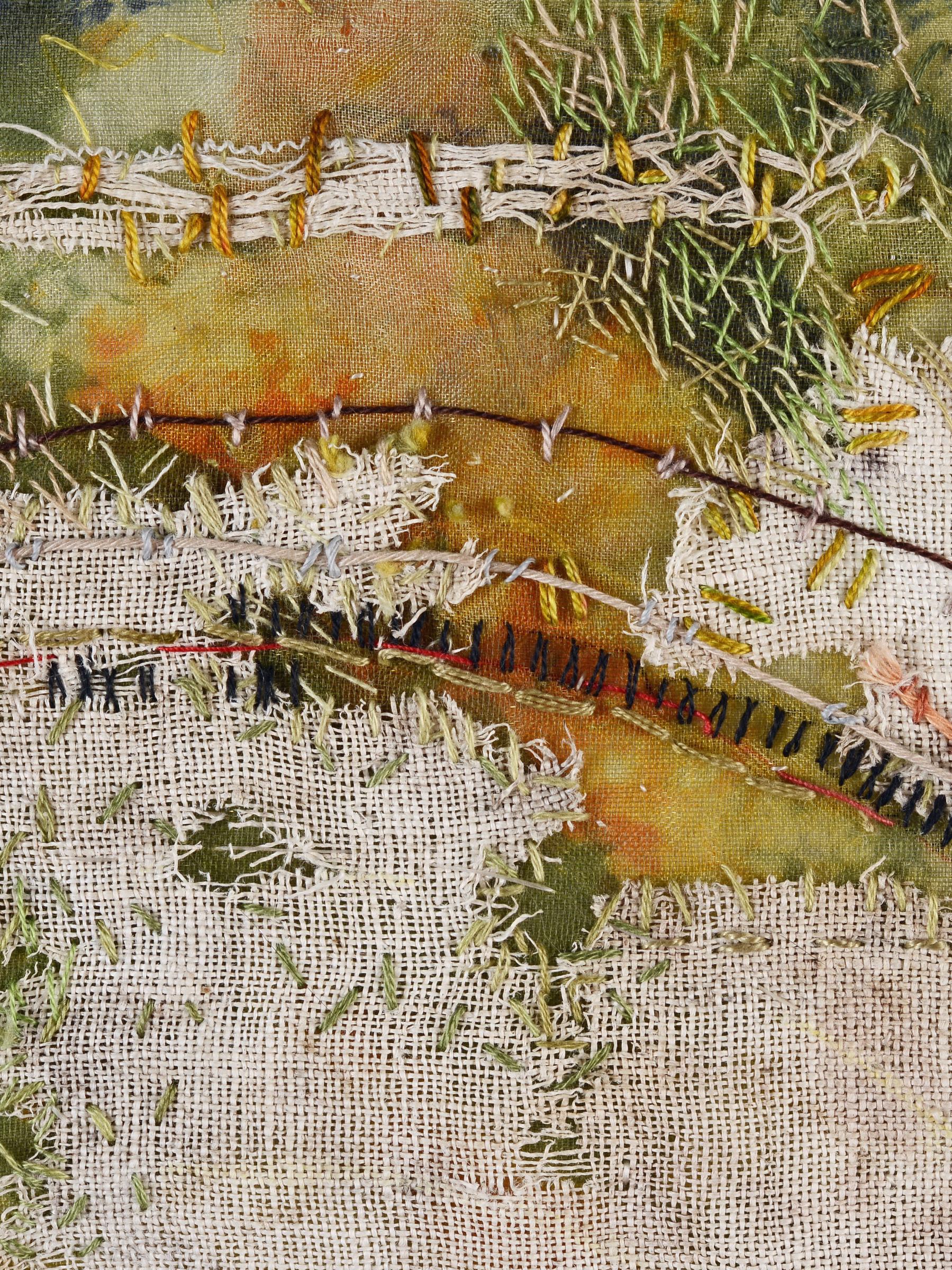 This work is focused on trees and the marks they make over time. A square of linen, inserted between a pair of vertically stacked logs, registers the shifts. Traces of that movement are documented in coloration from the bark and cut surface of the log, and by the disintegration of the cloth. My stitches call out that movement, gentle circles in fragments—the fundamental geometry of the tree in cross-section, and as future board-feet. Soft silk organza, dyed with the colors of a summer day, represents memories of air, light, and leaves.