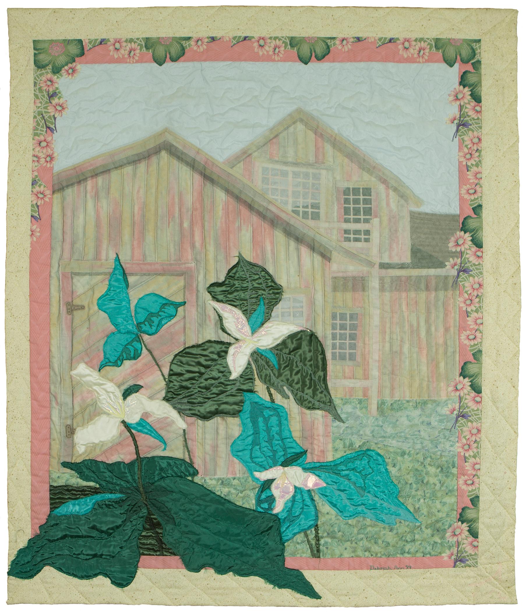 Wild Trillium growing outside my cabin and an old building I'd photographed were the inspiration for this work. This piece shows a major step in my development as I'm now using more quilting and fusible web to do raw edged applique. These are techniques I still use today.