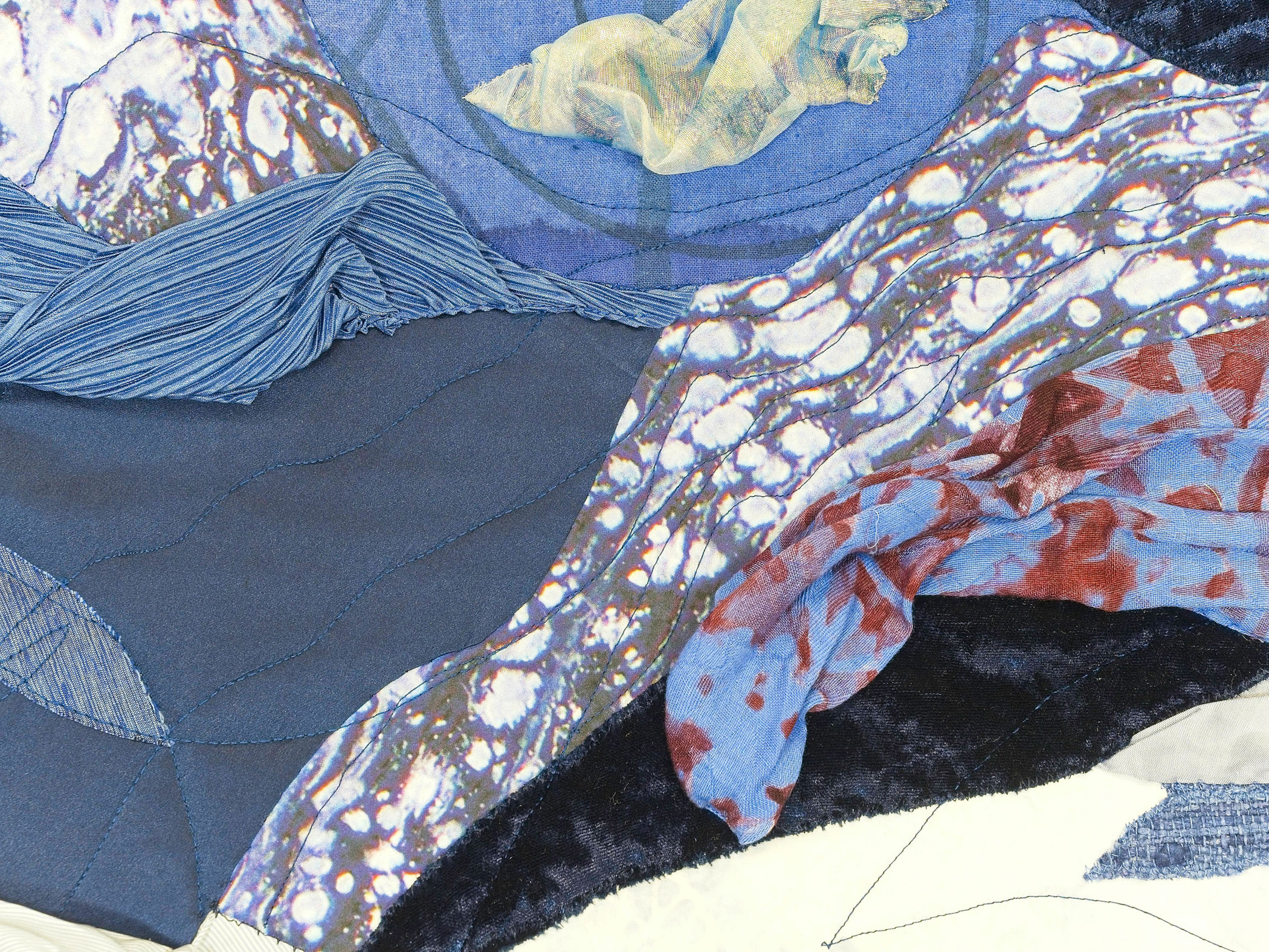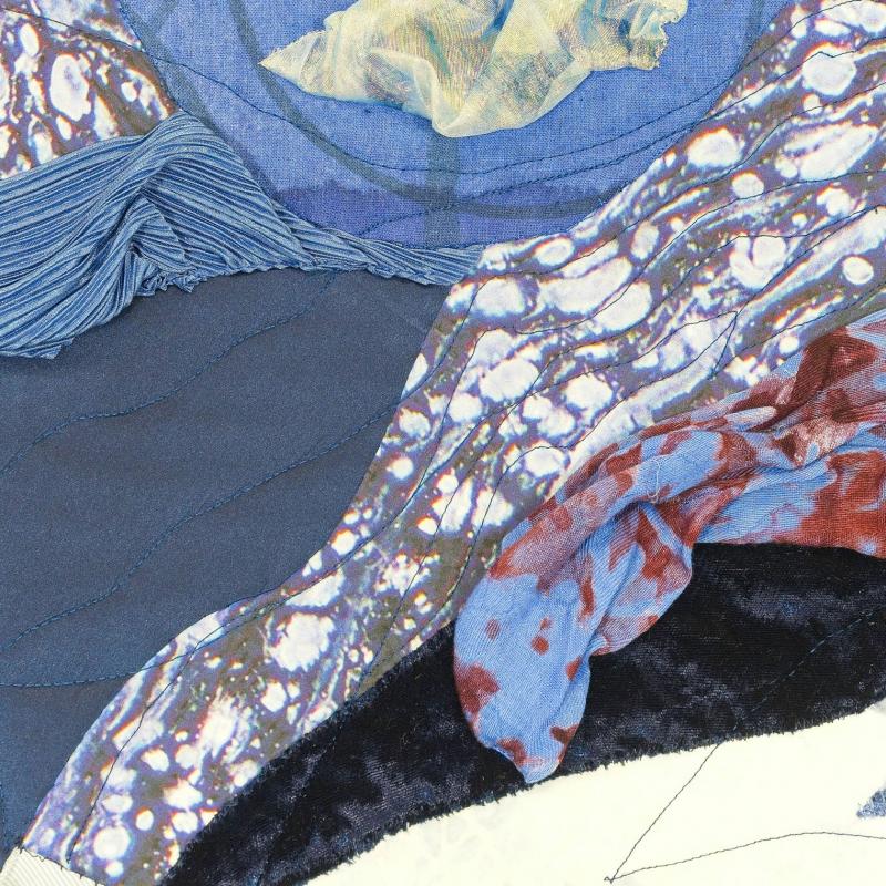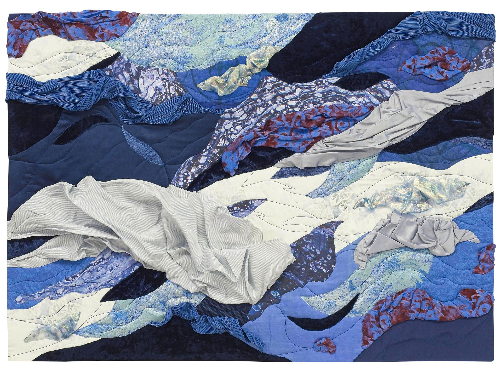 We can’t see wind, but we can feel it. This piece shows my visual interpretation of the chaotic and capricious changes in air pressure and wind velocity when there is turbulent air flow. I cut and draped different textures and shades of sky-colored fabric to mimic the “every-which- way” feel of wind buffeting my body when I’m caught outside in a windstorm.