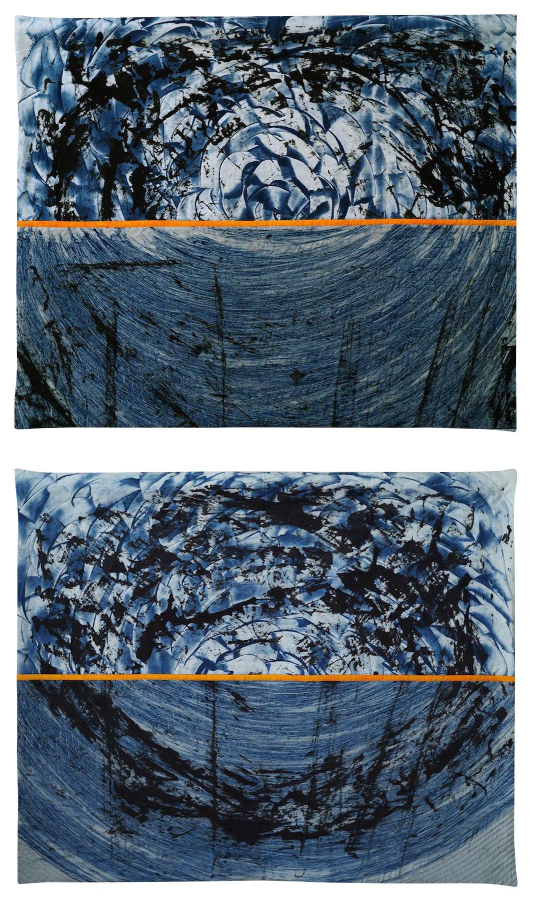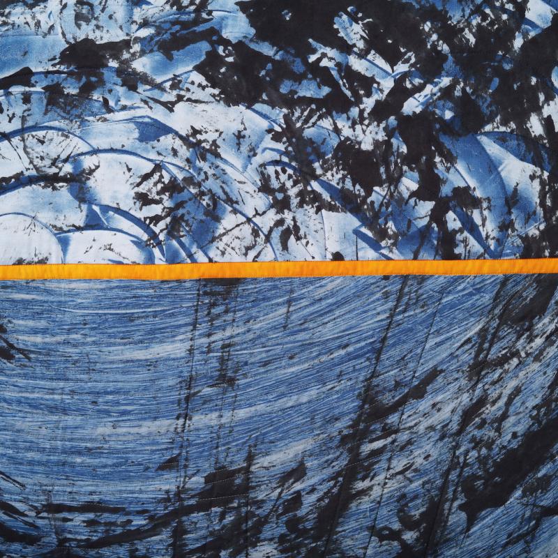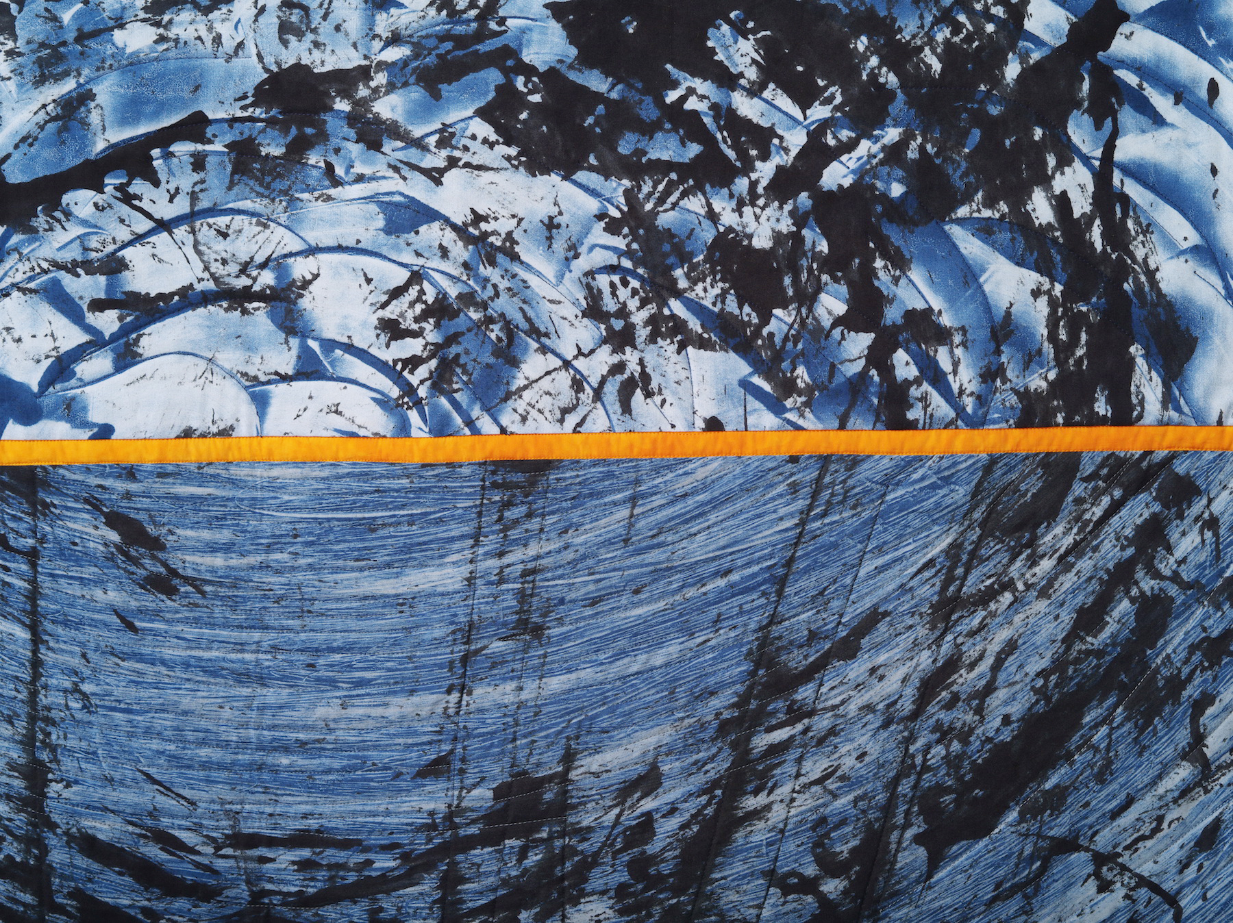 Turbulent Times grew from two whole cloth monoprints that were layered, recombined, pieced, and quilted into the two parts of this stacked diptych. The horizontal divisions suggest under and above (water) worlds. Much was lurking in our lives when the “normal” got stirred up by an invisible virus. The abstract dark marks and sweeping gestures evoke the ominous and omnipresent peril.