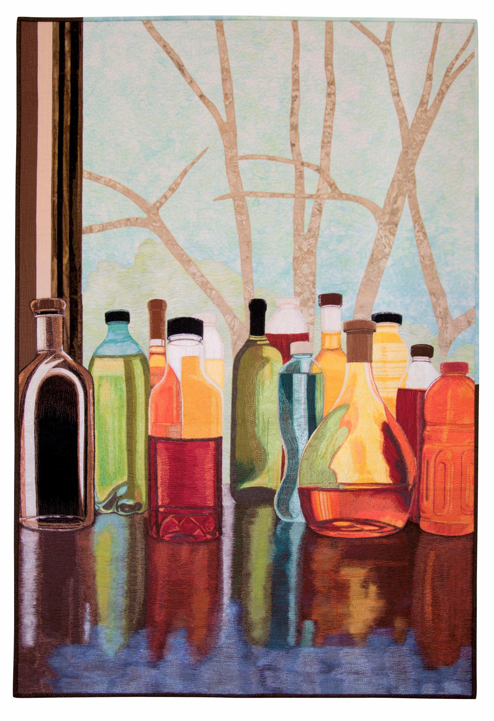 Outside, a gray winter day showed bare branches in my yard. Wanting to add some color to my surroundings, I started gathering all kinds of bottles from my kitchen, including ones holding juices, sodas, sports drinks, and wine. After removing most of the labels, I arranged them into a still life on an antique wooden table in a sunny window. The ordinary bottles were transformed into my own “stained glass” through the effects of transparency, translucency, luminosity, and reflection. Now I had a lovely scene to cheer up this chilly day. By combining colored glass and liquids with natural light, I lifted my spirits and was reminded to seek beauty in the everyday things around me.