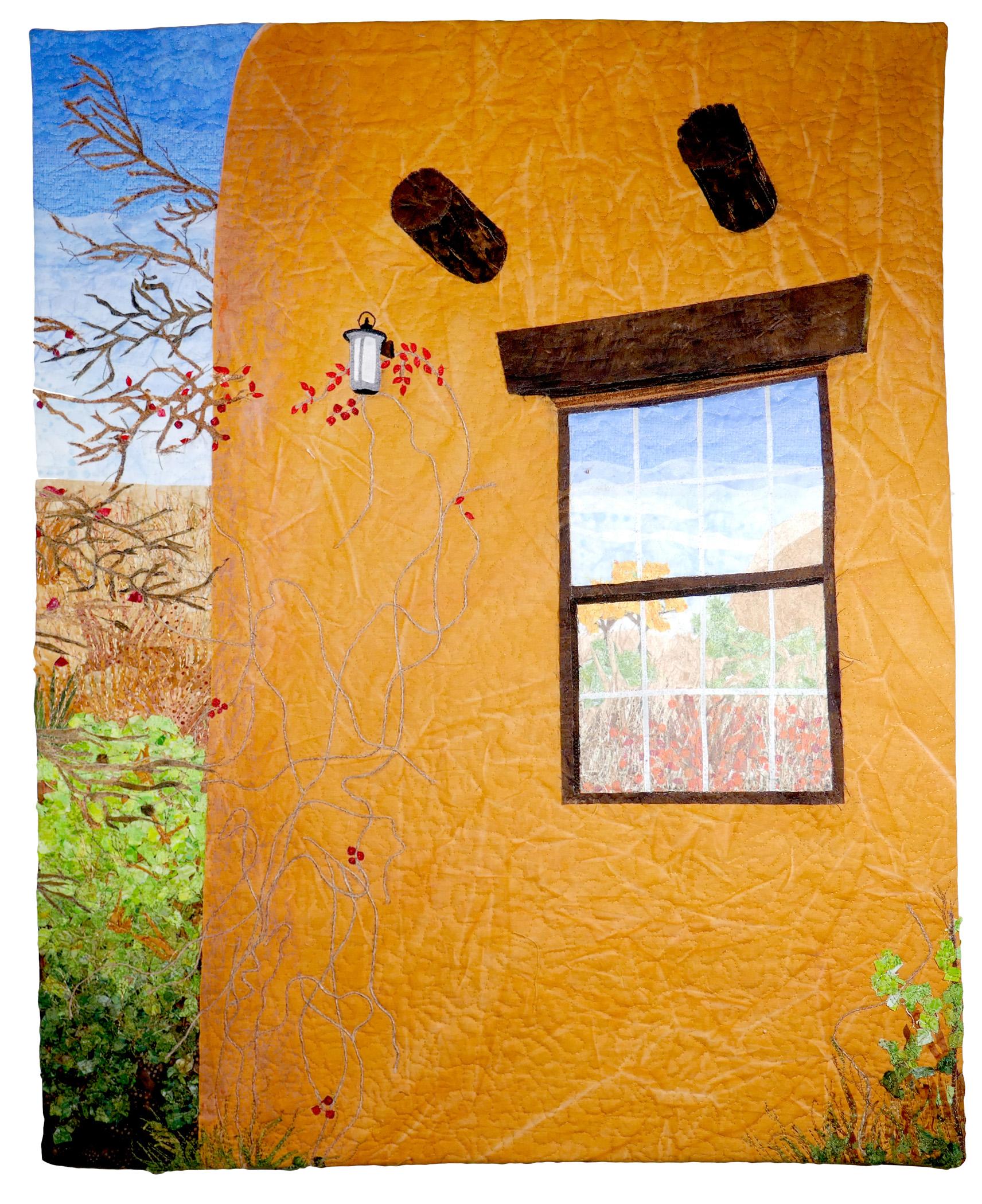 This quilt is a juxtaposition of creation--people created this stucco structure, but nature created the vine growing up the building and reaching toward the light. People created the window, but nature created the beautiful wild land reflected in it.