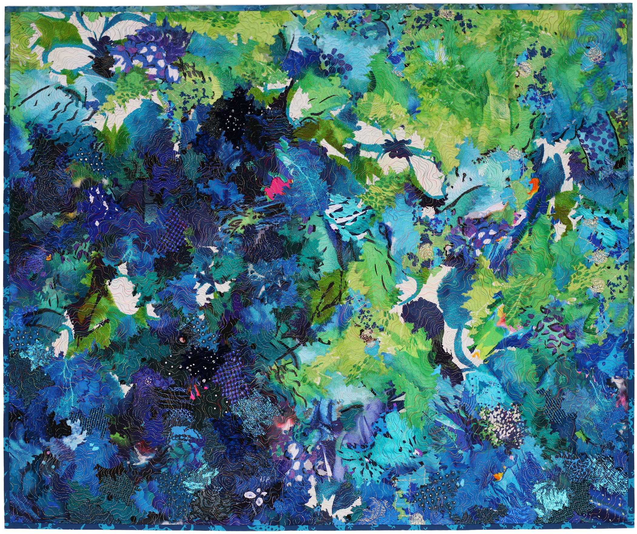 Small pieces on interfacing fusible fabric. Free motion machine quilted.