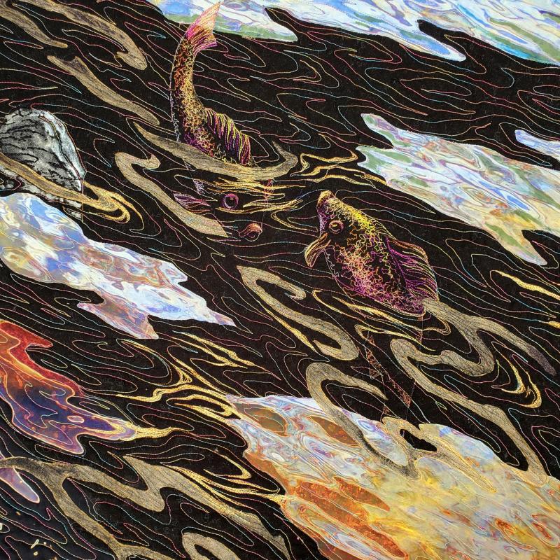 Digitally manipulated, photo transferred, fused appliqué, painted, machine embroidered, machine quilted