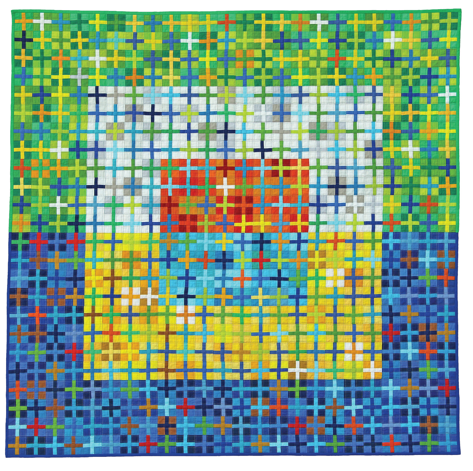 Cotton, artist created solid dyed fabrics, thread, cotton batting, artist created batik whole cloths machine pieced on the back.