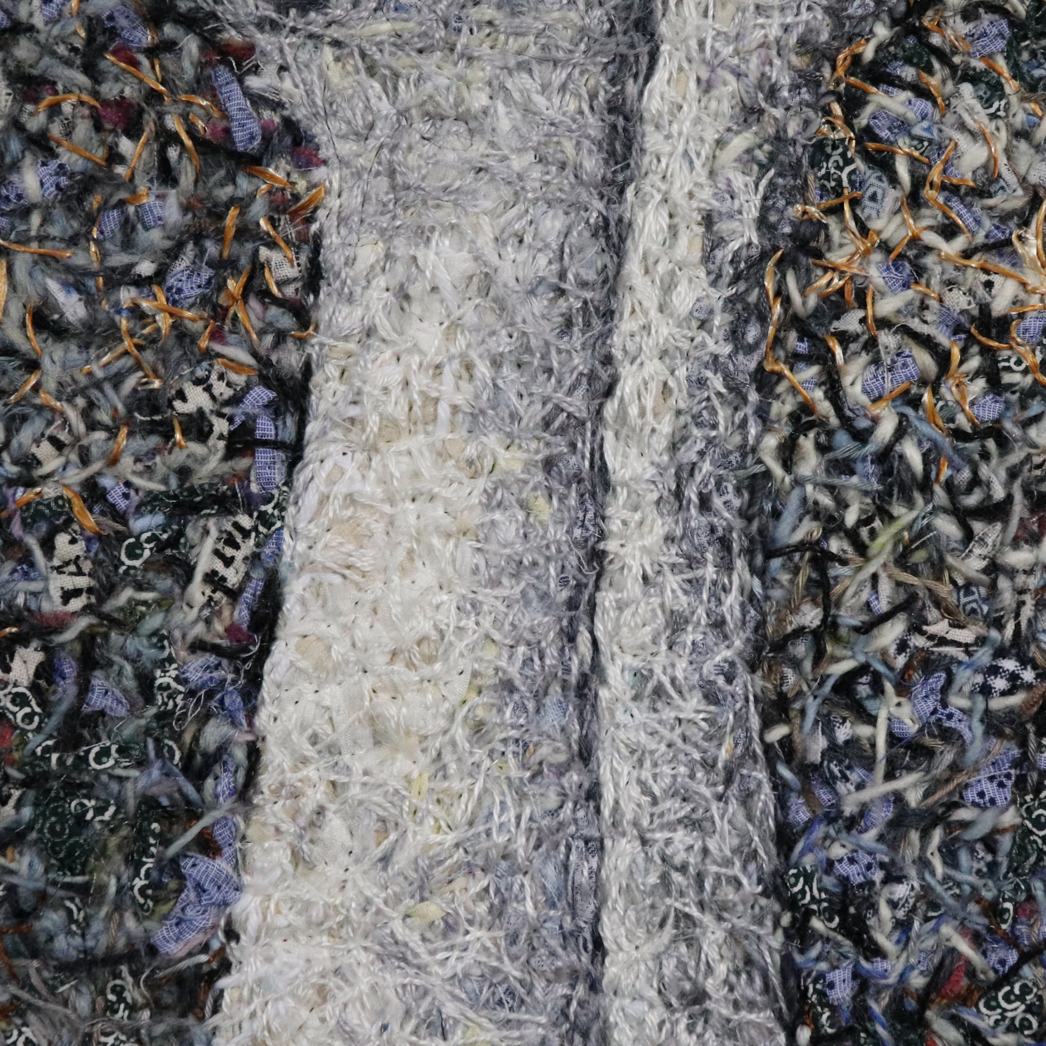 This piece is from a series of portraits contemplating encounters with birds as individuals (rather than as instances of their species), and the experience of both familiarity and mystery that arises in their presence. The image is created by surface weaving, an original technique that generates myriad colour interactions. When viewed at close range, the realistic image dissolves into countless micro-abstractions. These visual effects evoke a sense of the shifting light, complexity, and liveliness that one can experience in nature.
