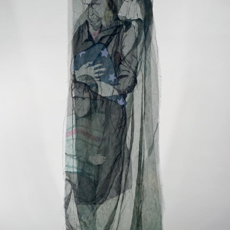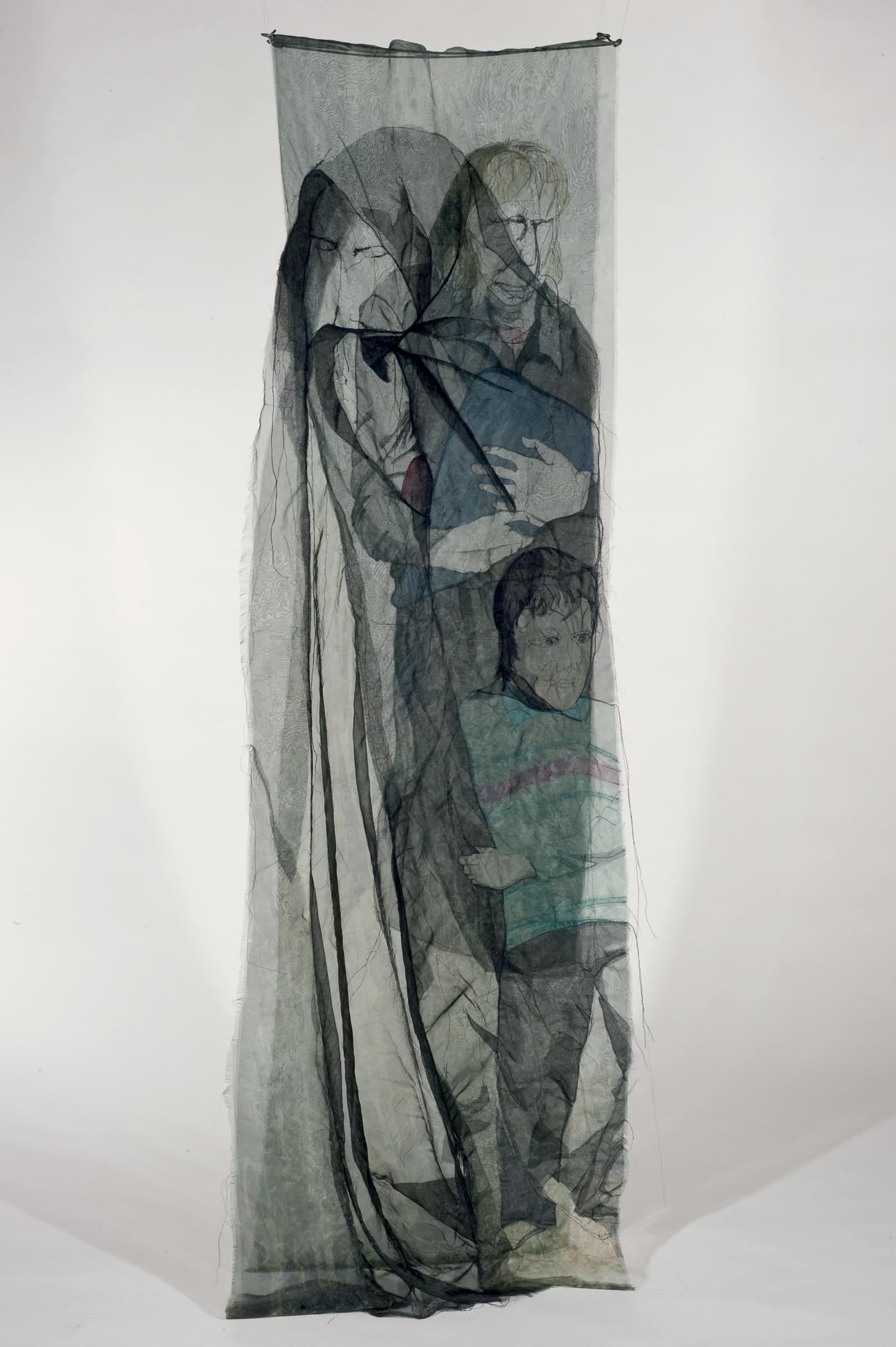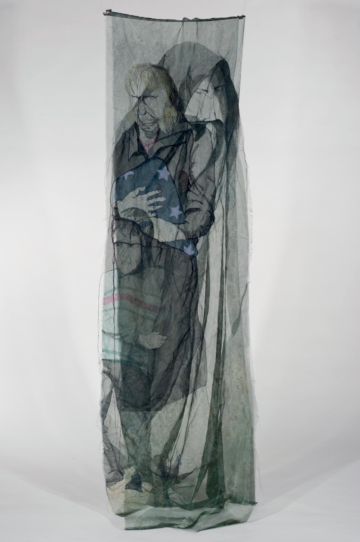 In my "Unwearable War" series I am looking at how people, women in particular, carry the psychological effects of war. Two-sided War depicts 2 women, one American and one Iraqi, both grieving the loss of a loved-one as a result of the same incident. Because I use sheer materials, the lines from one side are shared with the other. One woman's arm is also the other woman's. And who does the young boy stand with? Is he a future soldier? For which side will he fight?