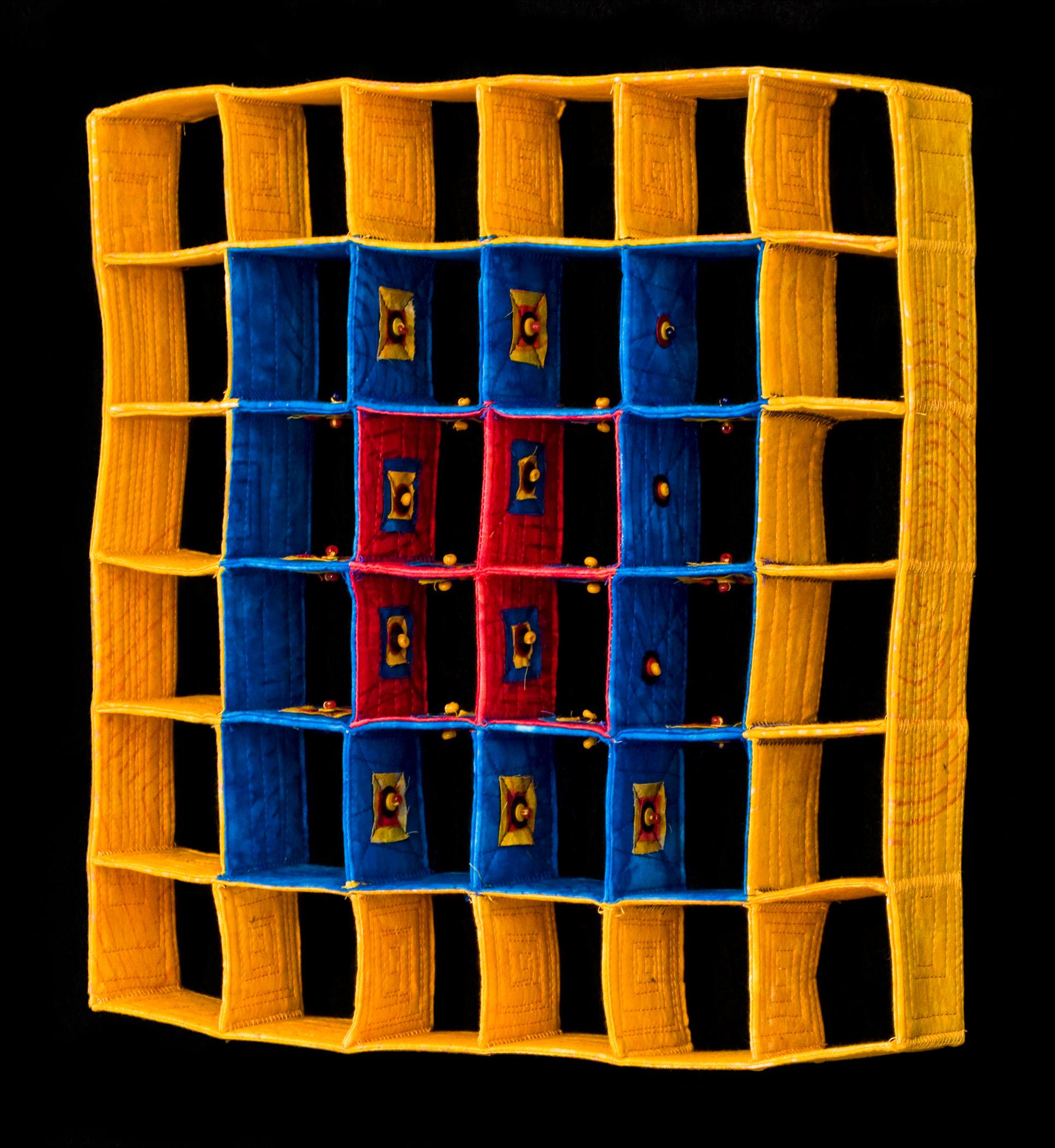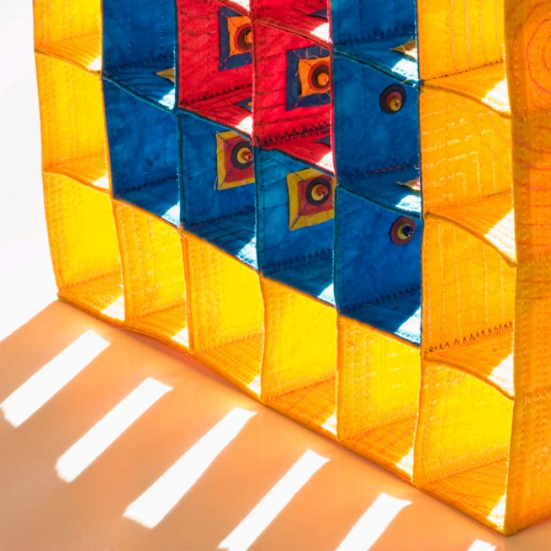I employ a sketchbook and sewing machine to sculpt my colorful fabric creations. Bright colors and movement are predominant elements of the repetitive grid structure that allows light and shadow to create new patterns and colors.