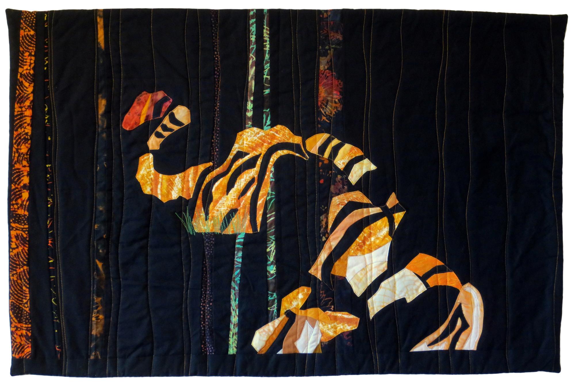 I created Tyger in Tall Grass for a show called Momentary and Timeless at the San Jose (CA) Museum of Quilts and Textiles in Spring 2019. Researching artistic images of tigers I was amazed to see paintings, inked scrolls, even tattoo designs. One, with the hunting tiger almost submerged in tall grass, especially appealed. So does William Blake’s (1794) poem: