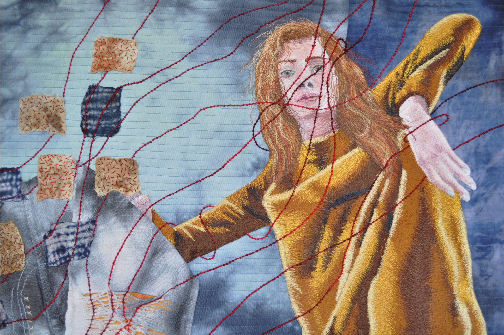 I wanted to bring an idea of movement to the piece. I added pulled thread work and created a new weft on the shirt (found in my grandmother’s attic). The shredded fabric and the inner color that imposed itself on the character, created a sense of how the future dances with the past!