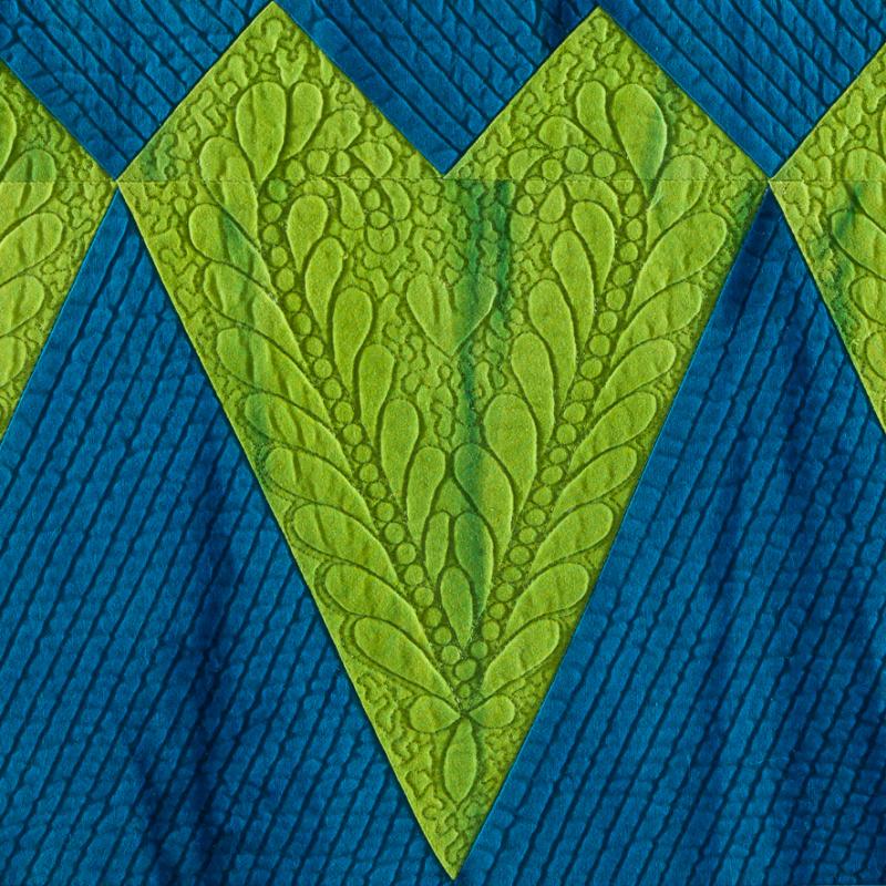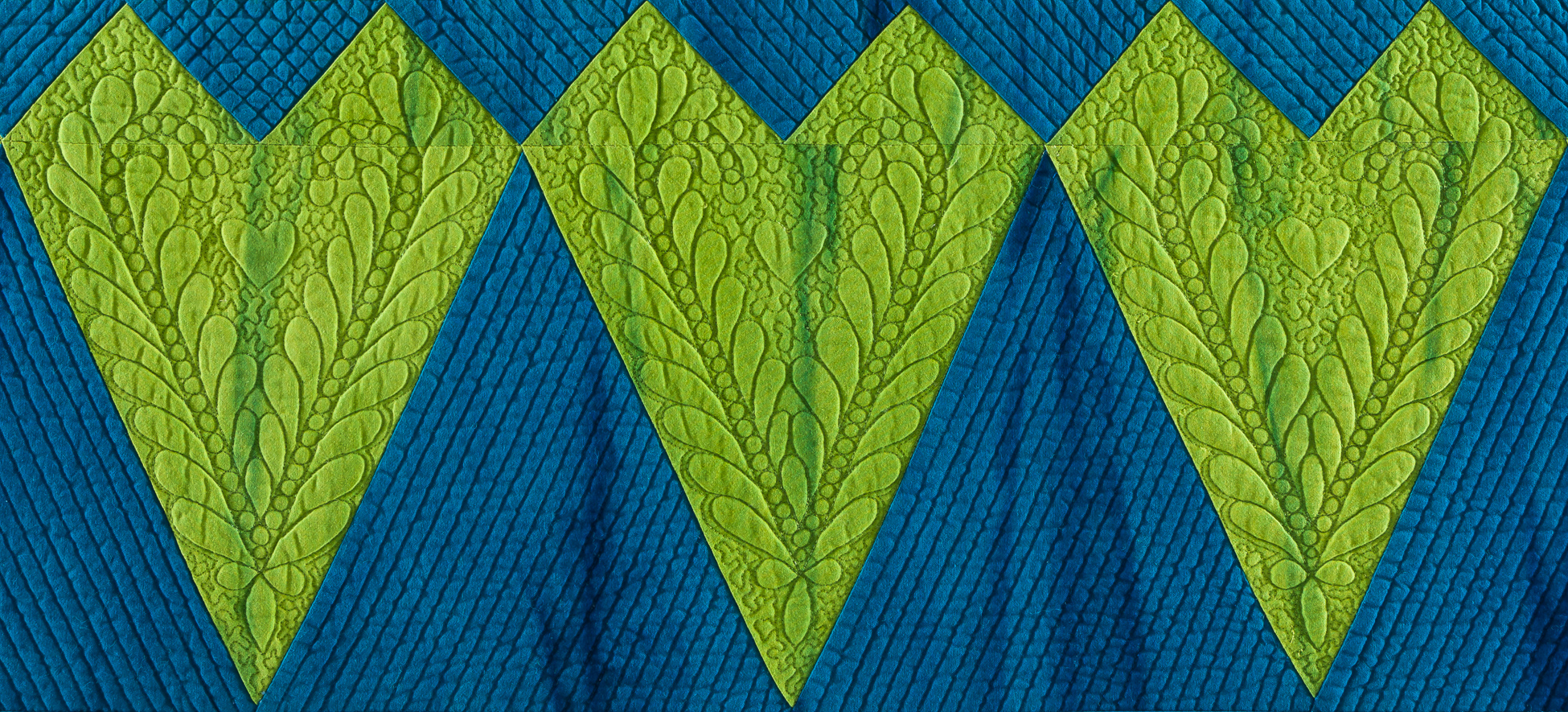 “Unfurling” is a curved pieced original design. It was inspired by my daily walks in the woods. It represents spring trees unfurling their leaves to a new year.